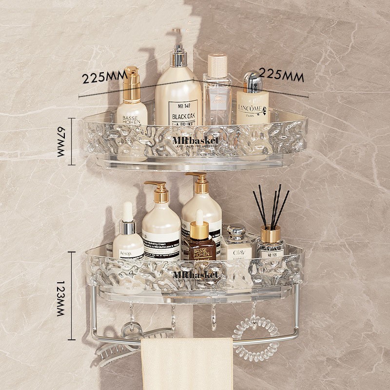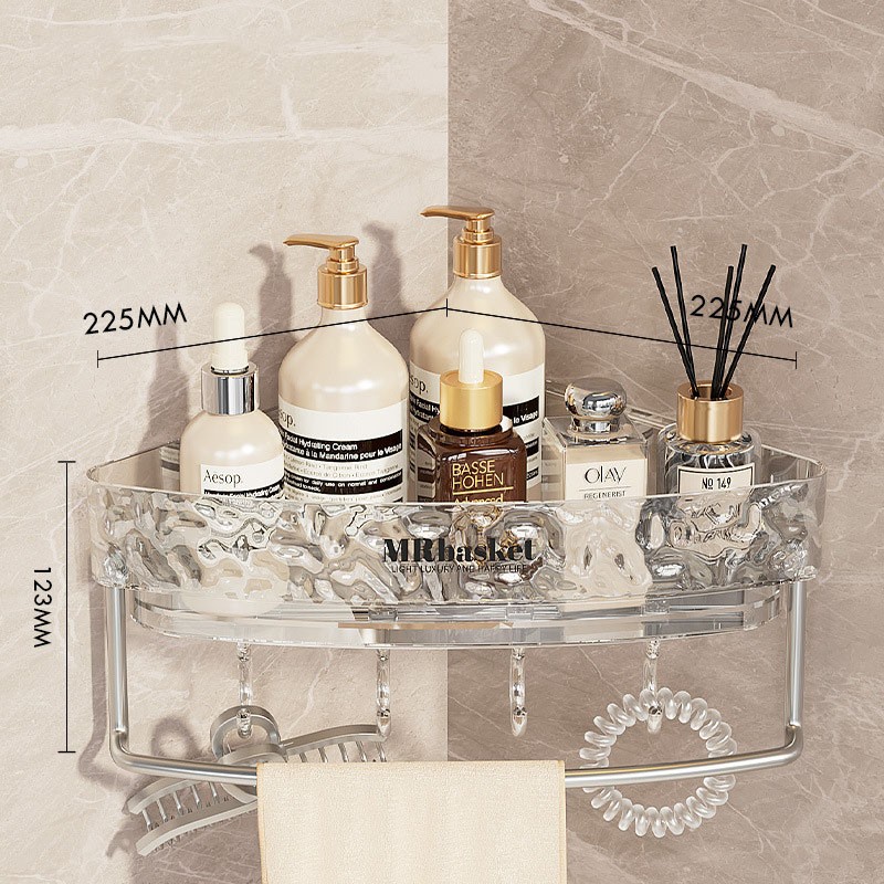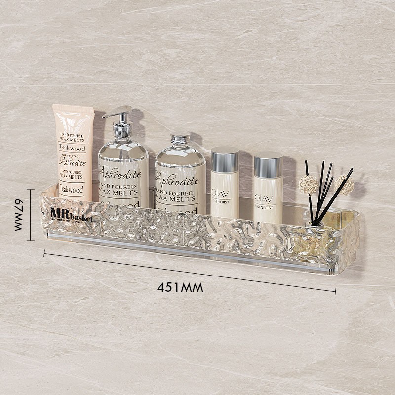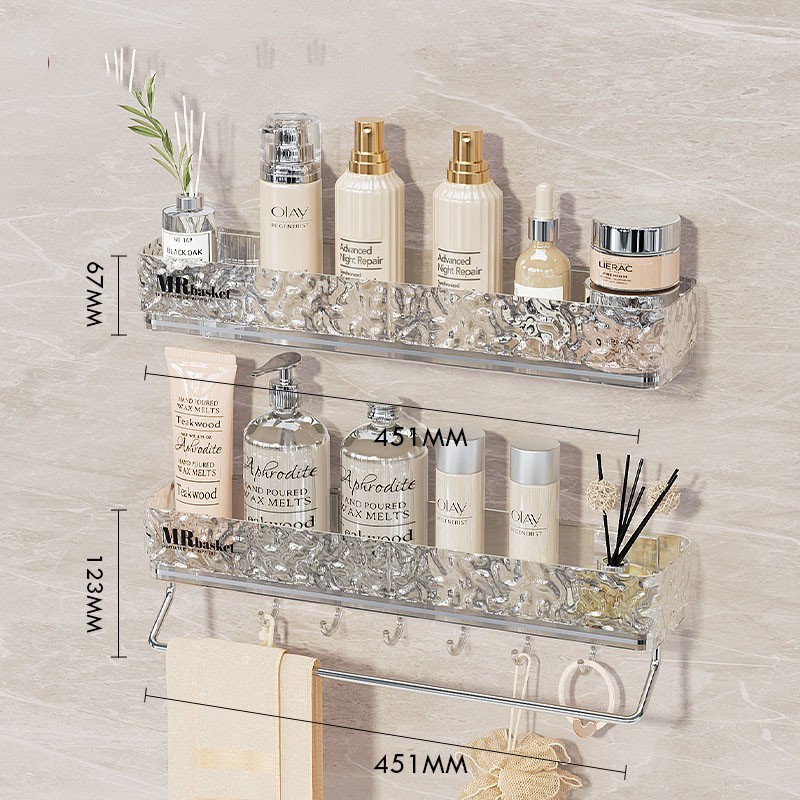 Стильна прозора полиця для ванної кімнати з фактурного акрилу — сучасне рішення для зберігання косметики та аксесуарів. Модель представлена у прямому та кутовому варіантах, а також у версіях з гачками та тримачем для рушника.