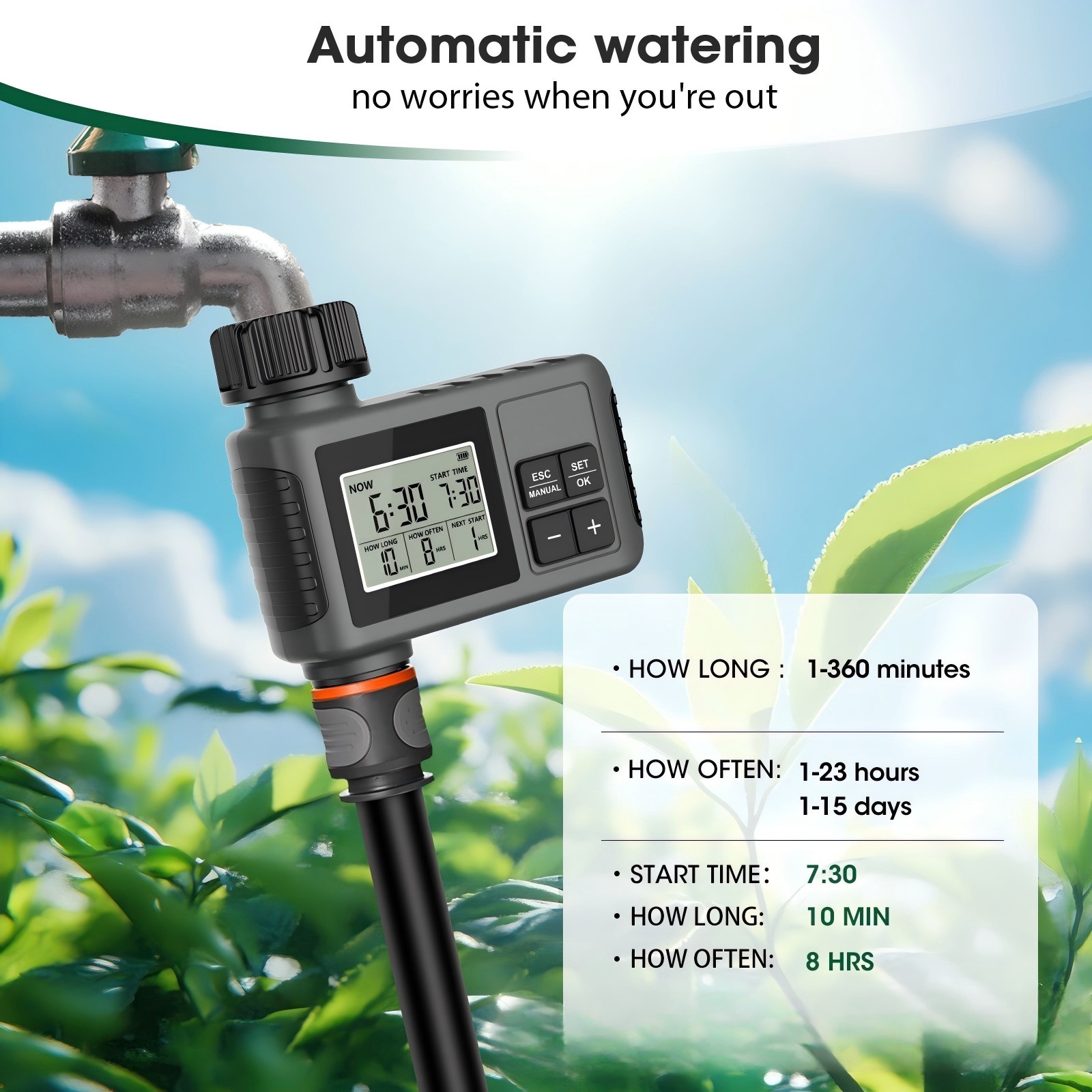 Пристрій має великий екран для зручного налаштування параметрів та простий монтаж, що дозволяє швидко інтегрувати його у вже існуючу систему поливу. Підходить для домашнього садівництва, озеленення територій та садово-городніх господарств. Автоматичний полив особливо корисний під час відсутності власника, забезпечуючи рослини необхідною кількістю вологи за встановленим графіком.
