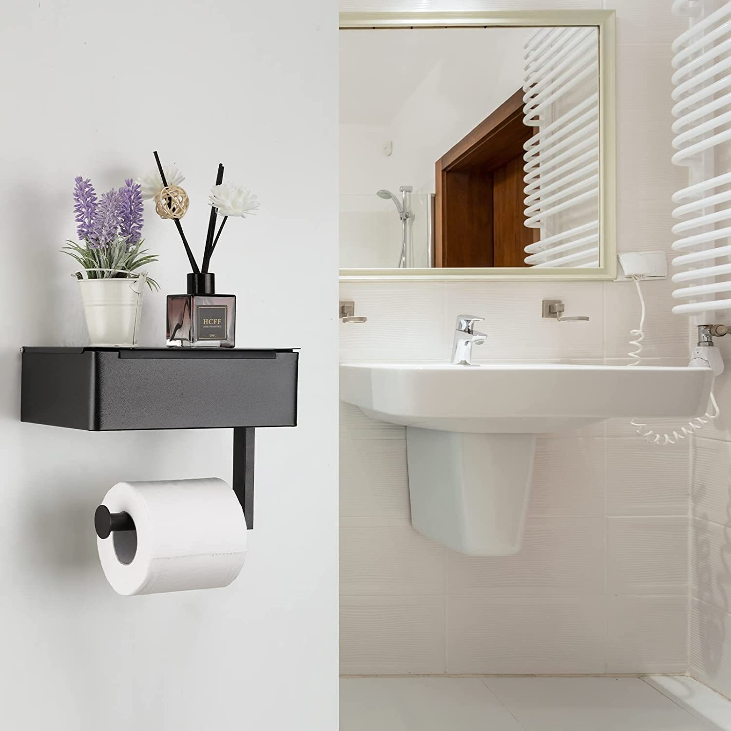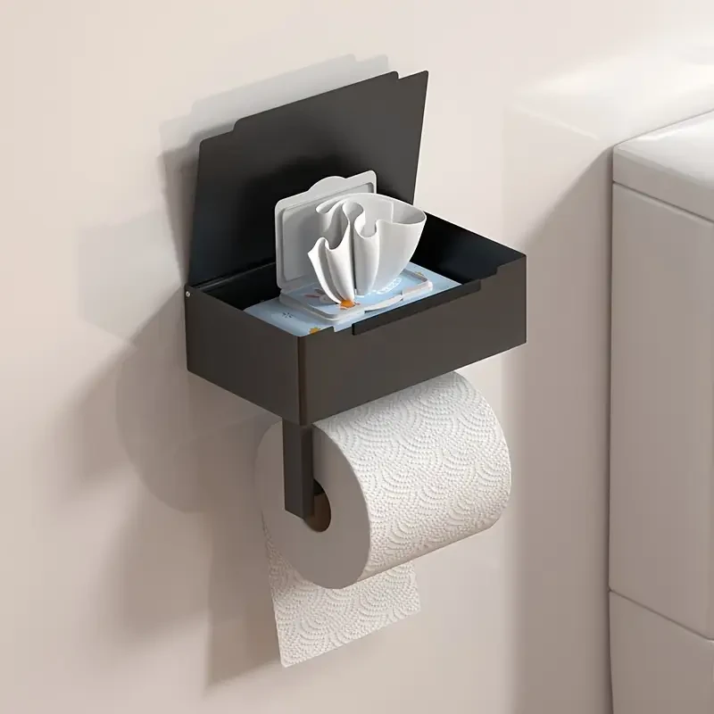 Функціональний тримач поєднує в собі тримач для рулону та закритий бокс для зберігання вологих серветок, масок або інших гігієнічних засобів. Кришка захищає вміст від пилу та вологи, забезпечуючи акуратний вигляд.