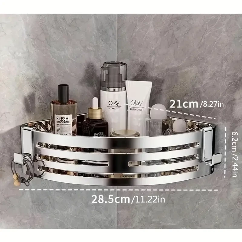Полиця виготовлена з міцного металу з хромованим покриттям, стійким до вологи та корозії. Завдяки перфорованій конструкції вода не накопичується на поверхні, що запобігає появі іржі та нальоту.