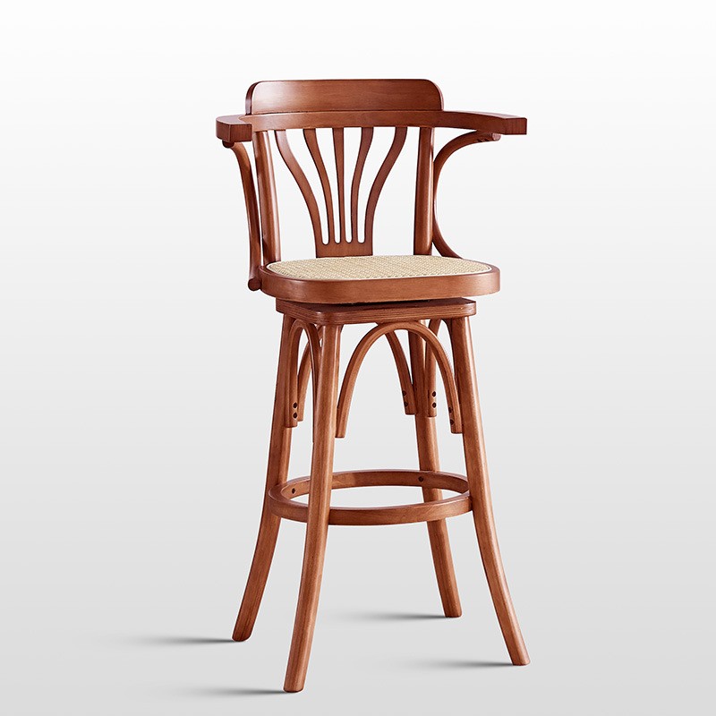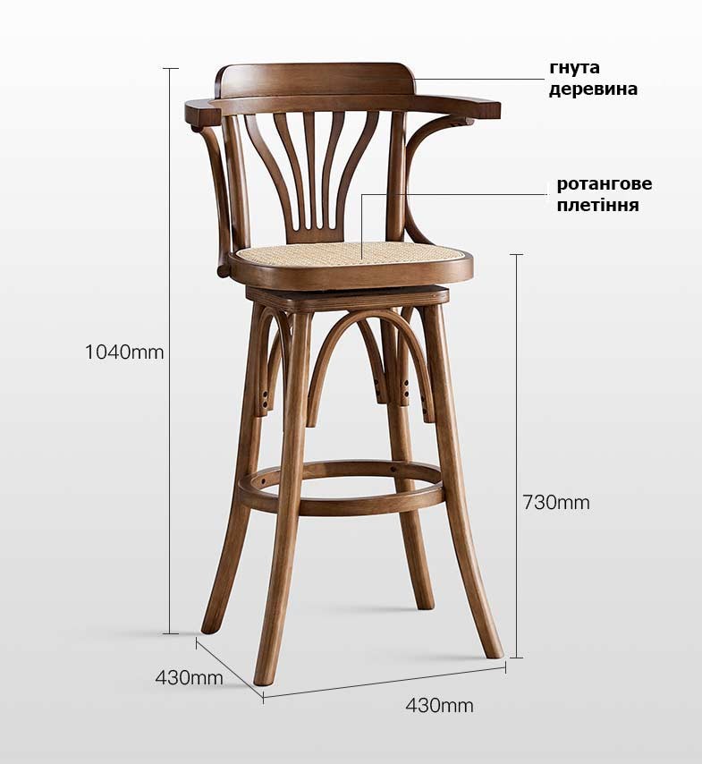 Каркас із міцного гнутого дерева гарантує довговічність і стійкість конструкції. Зручні підлокітники та спинка забезпечують комфортну посадку навіть під час тривалого використання. Стілець має поворотний механізм, що робить його практичним для барної стійки або кухонного острова.