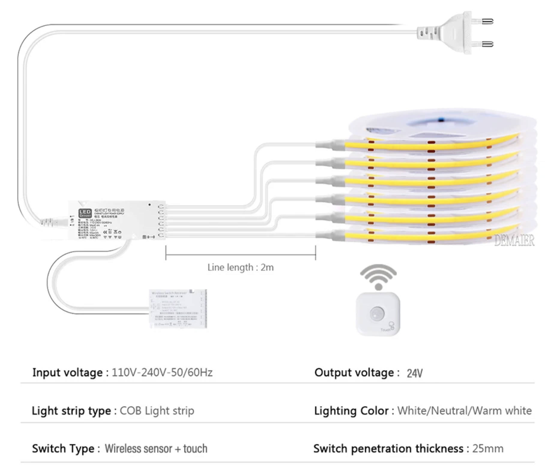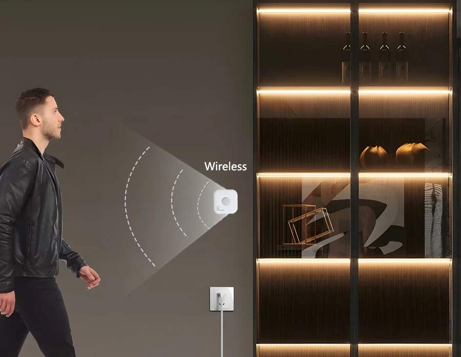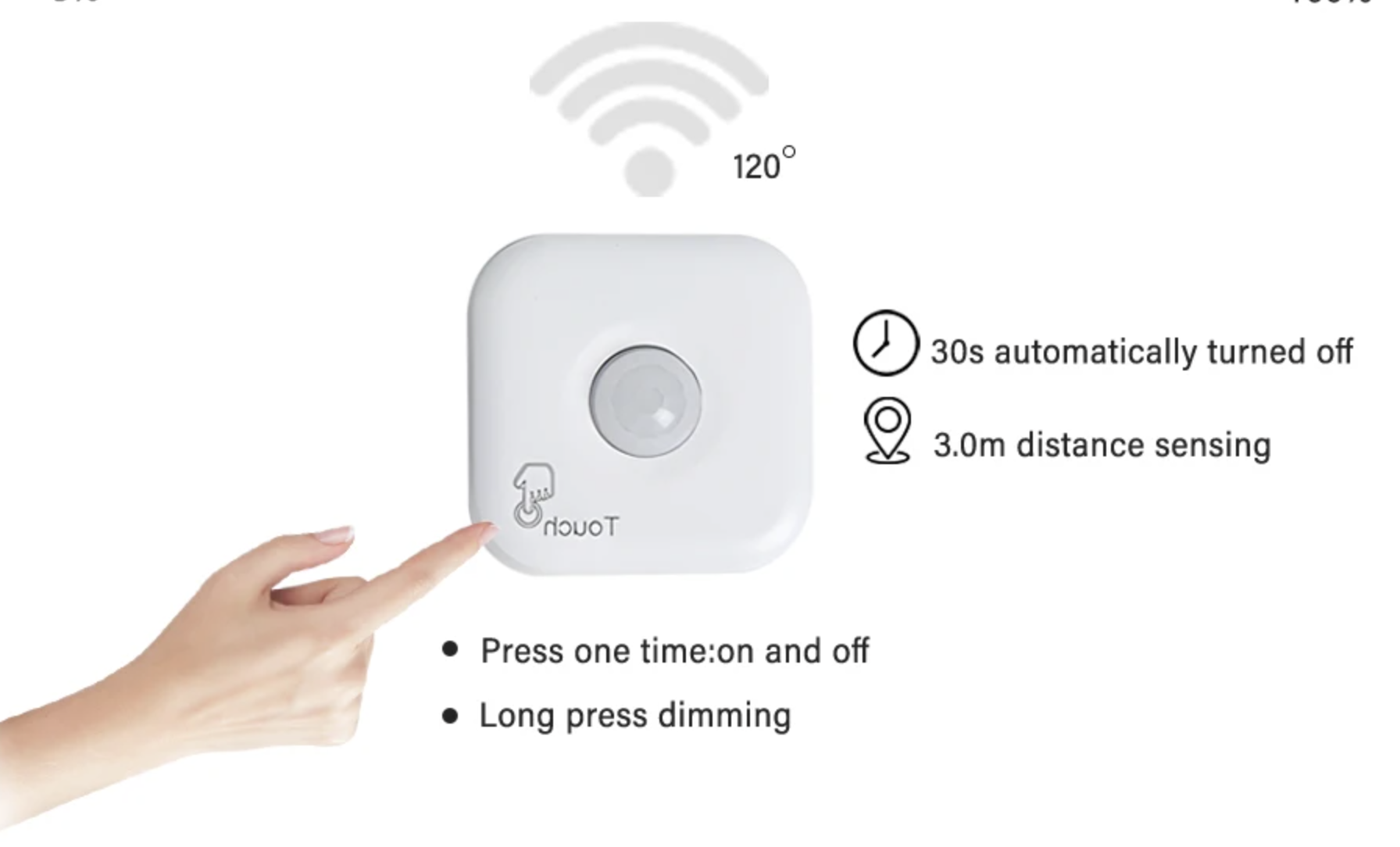 Бездротовий сенсорний вимикач з інфрачервоним датчиком руху призначений для автоматичного керування LED-освітленням у шафах, гардеробах, нішах та інших меблевих або інтер’єрних зонах. Пристрій реагує на присутність людини та/або дотик, автоматично вмикає світло і вимикає його після заданої затримки.