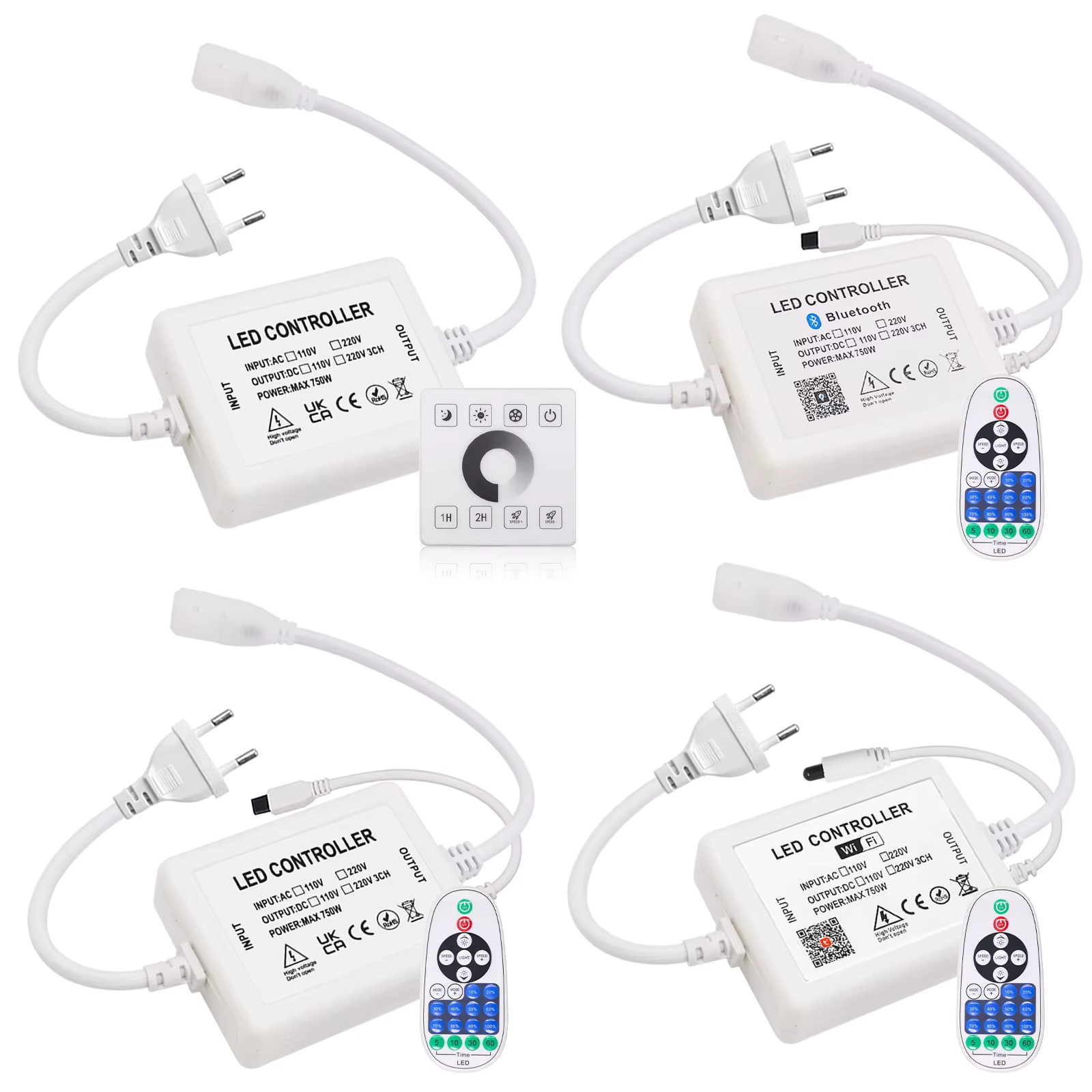 Bluetooth RGB-контролер для високовольтних LED-стрічок і неонової підсвітки 220V призначений для керування кольором, яскравістю та світловими ефектами без додаткових блоків живлення. Пристрій підключається безпосередньо до мережі 220 В і дозволяє керувати освітленням через мобільний додаток, а також за допомогою інфрачервоного або RF-пульта (залежно від комплектації).