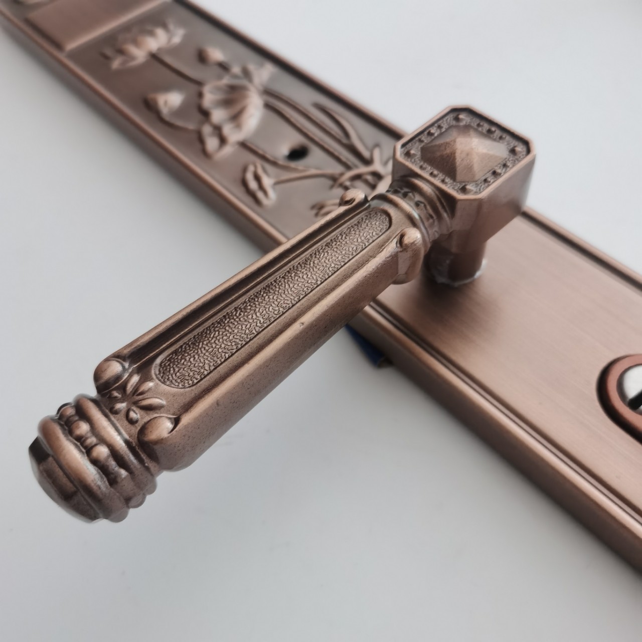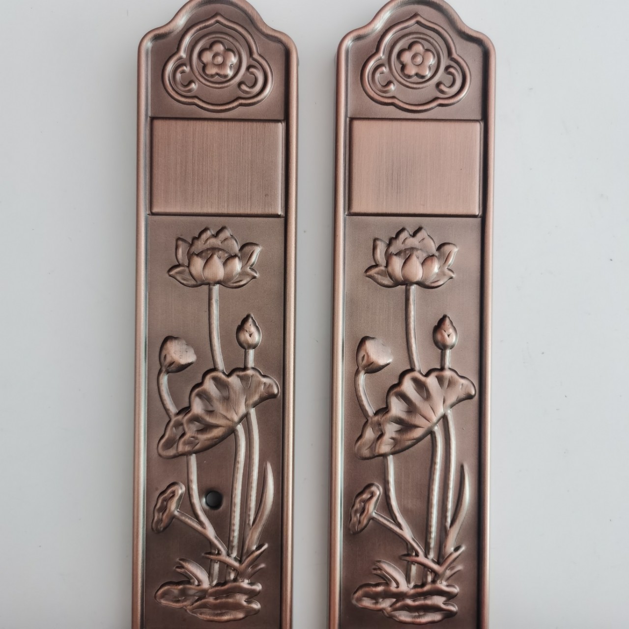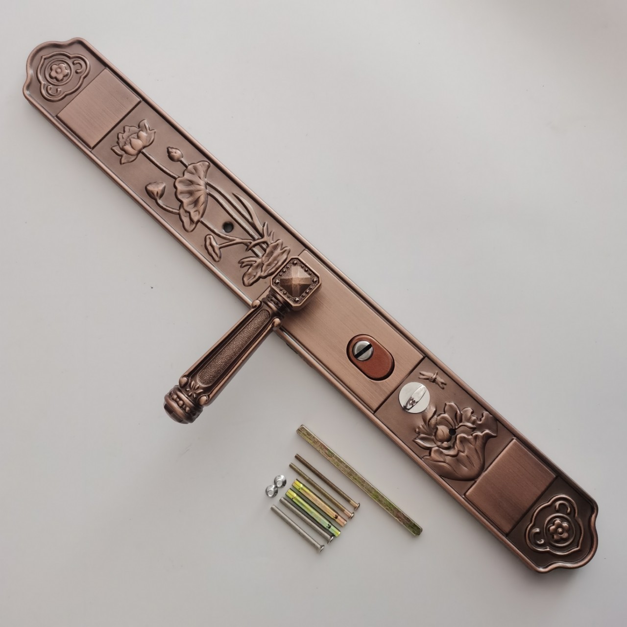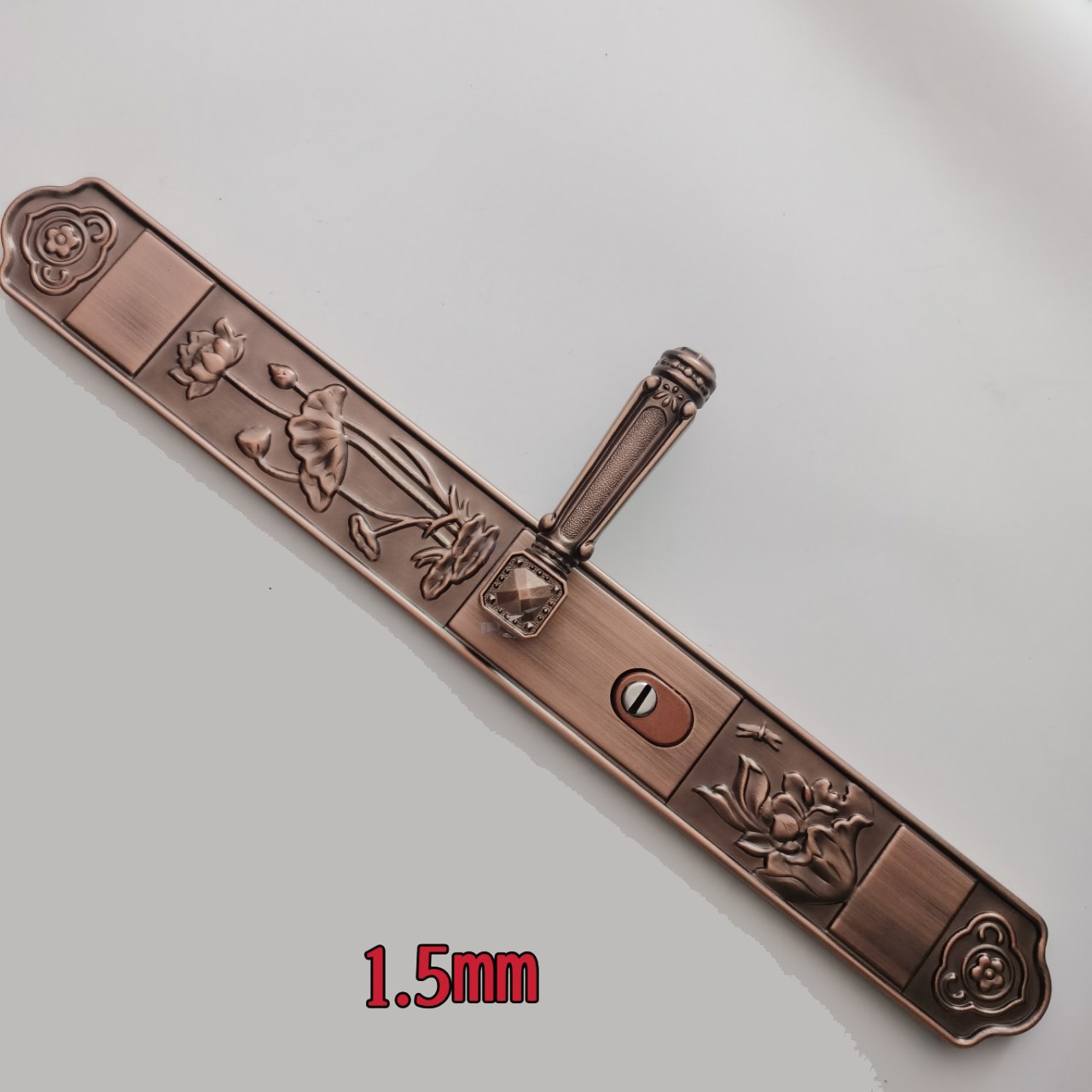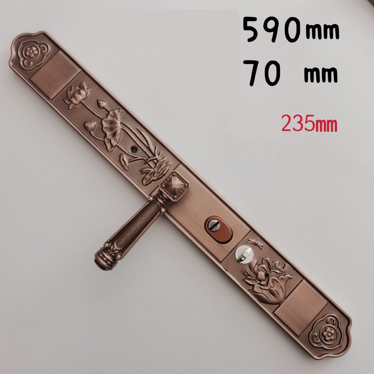 Декоративна дверна ручка з довгою планкою у класичному стилі з рельєфним візерунком. Виконана у дизайні з традиційними мотивами (слива, орхідея, бамбук, хризантема), що символізують елегантність і статус.