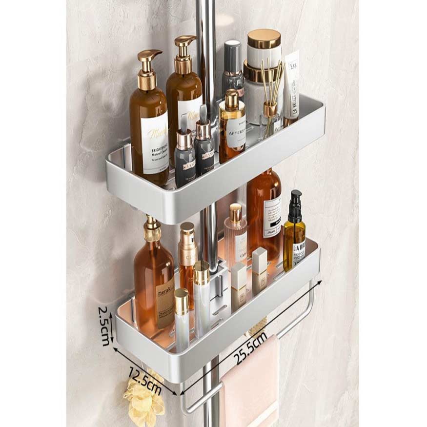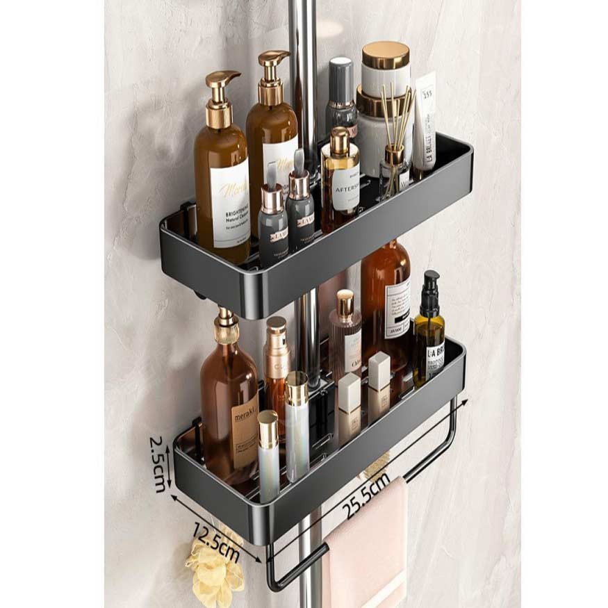Дворівнева полиця для душової штанги 25.5 см з тримачем для рушника, алюмінієва, регульована, чорна / срібна / сіра