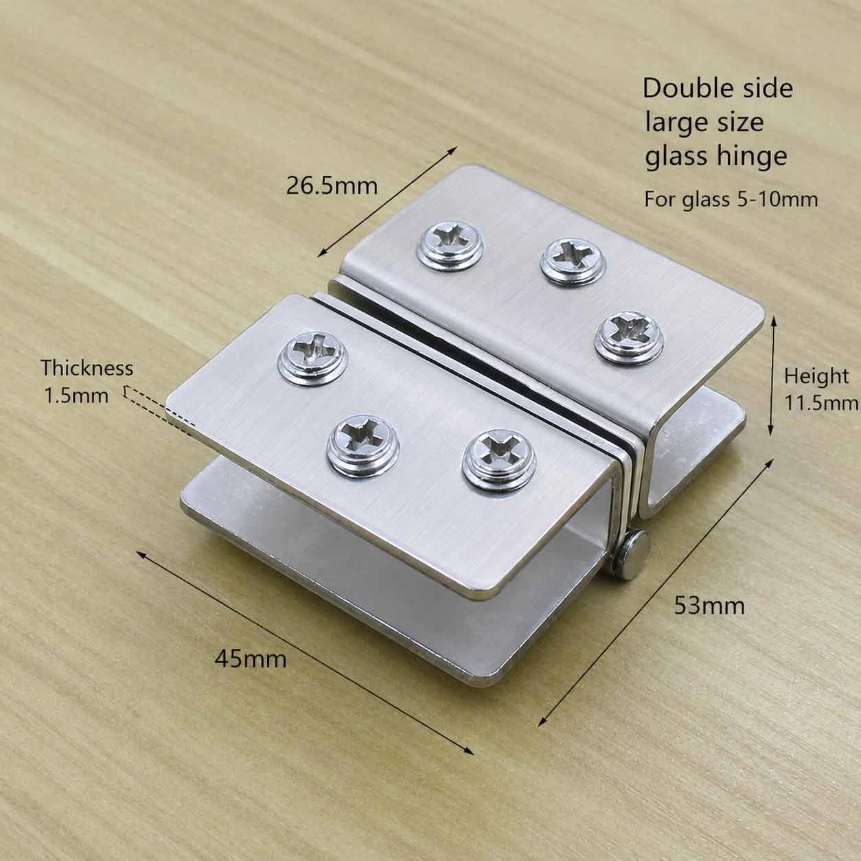 Посилена двостороння петля для скляних дверцят призначена для монтажу в меблевих шафах, вітринах, торгових стендах та інших скляних конструкціях. Завдяки двосторонньому механізму забезпечує плавне відкривання та стабільну фіксацію дверцят. Виготовлена з міцної нержавіючої сталі товщиною 1,5 мм, що гарантує довговічність, стійкість до корозії та зношування. Підходить для скла товщиною від 5 до 10 мм і забезпечує надійне затискання без пошкодження поверхні скла.