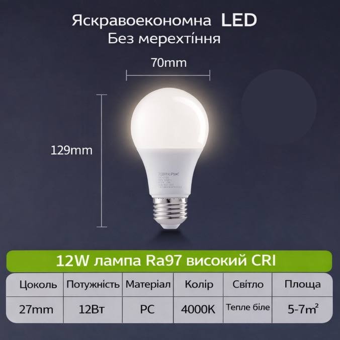 Енергоефективна LED лампа з цоколем E27 забезпечує яскраве та комфортне освітлення без мерехтіння. Завдяки високому індексу передачі кольору Ra97 світло максимально природно передає кольори предметів, що робить її ідеальним вибором для дому, офісу або робочих приміщень.