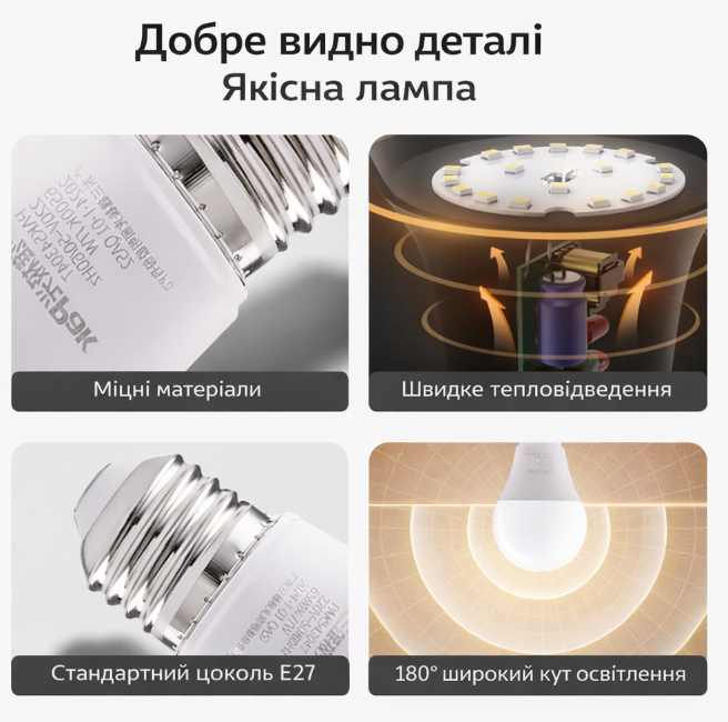 Лампа поєднує низьке енергоспоживання, довгий термін служби та стабільне освітлення, що дозволяє економити електроенергію без втрати якості світла.