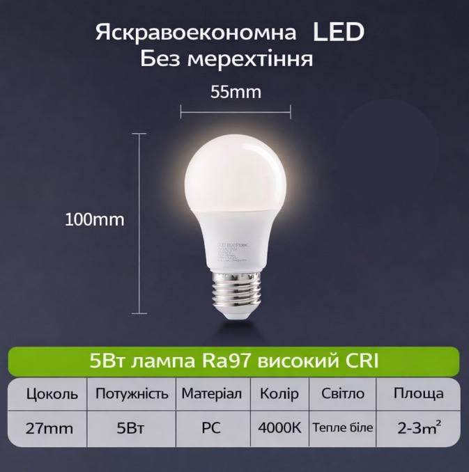 Енергоефективна LED лампа з цоколем E27 забезпечує яскраве та комфортне освітлення без мерехтіння. Завдяки високому індексу передачі кольору Ra97 світло максимально природно передає кольори предметів, що робить її ідеальним вибором для дому, офісу або робочих приміщень.