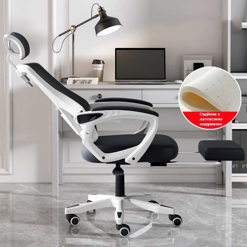 Крісло оснащене регулюванням висоти, поворотним механізмом та зручною висувною підставкою для ніг, що дозволяє розслабитися під час відпочинку. Завдяки сучасному мінімалістичному дизайну воно добре підходить для офісу, домашнього кабінету або робочого місця.