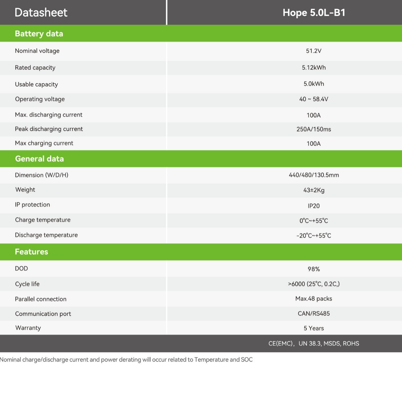 Growatt Hope 5.0L-B1 — це компактна літій-залізо-фосфатна батарея для домашніх систем накопичення енергії та сонячних електростанцій. Модель має номінальну напругу 51.2 В (клас 48 В) і корисну ємність близько 5.0 кВт·год, що робить її сумісною з більшістю гібридних та off-grid інверторів.