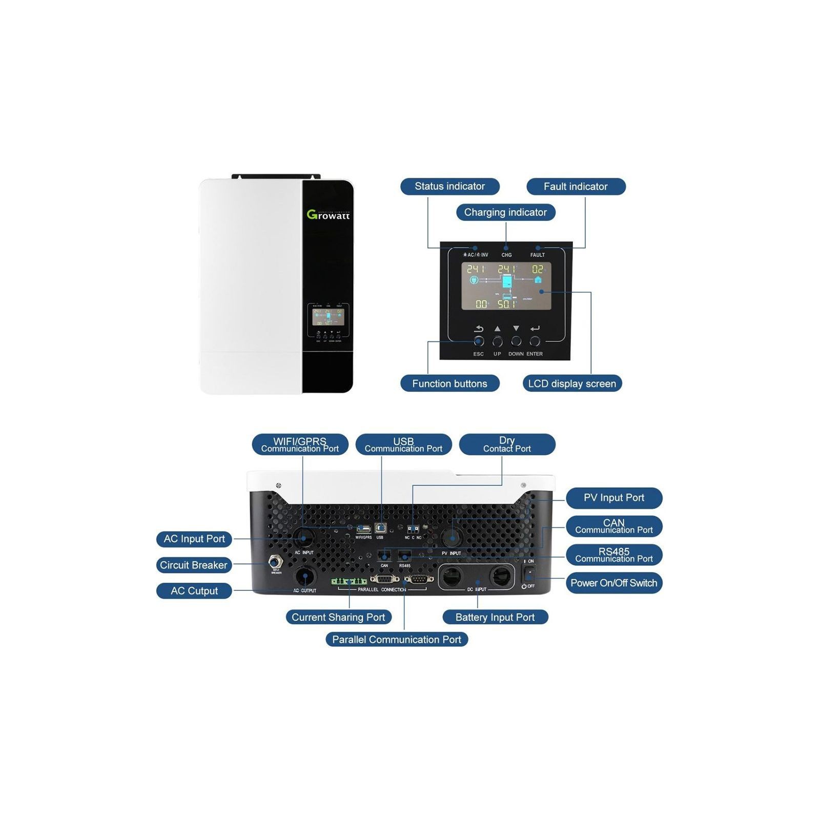 Growatt SPF 3500–5000 ES — це серія потужних автономних (off-grid) сонячних інверторів із підтримкою акумуляторів, призначених для домашніх, комерційних та мобільних енергосистем.