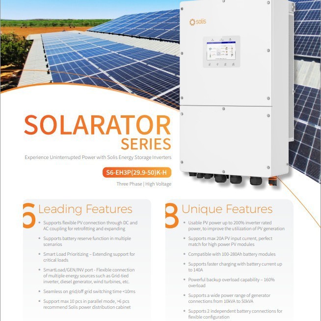 Гібридний інвертор SOLIS серії S6-EH3P (30 / 40 / 50 kW) — це високопотужне рішення європейського стандарту для комерційних і житлових сонячних електростанцій з підтримкою систем накопичення енергії.