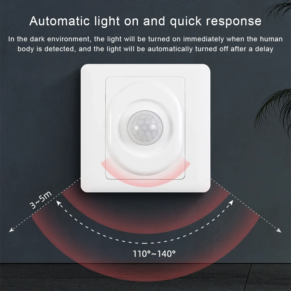 Корпус виготовлений із вогнестійкого PC та ABS-пластику, що забезпечує довговічність та безпечну експлуатацію. Датчик підходить для систем автоматичного освітлення у громадських туалетах, офісах, торгових центрах та інших об’єктах.