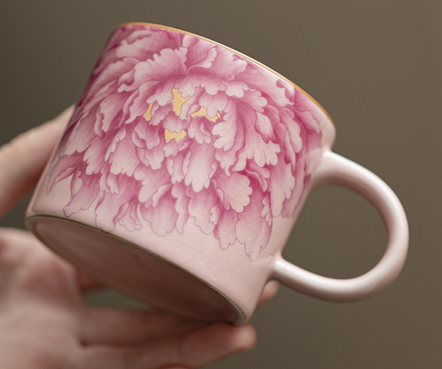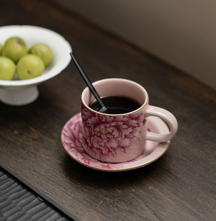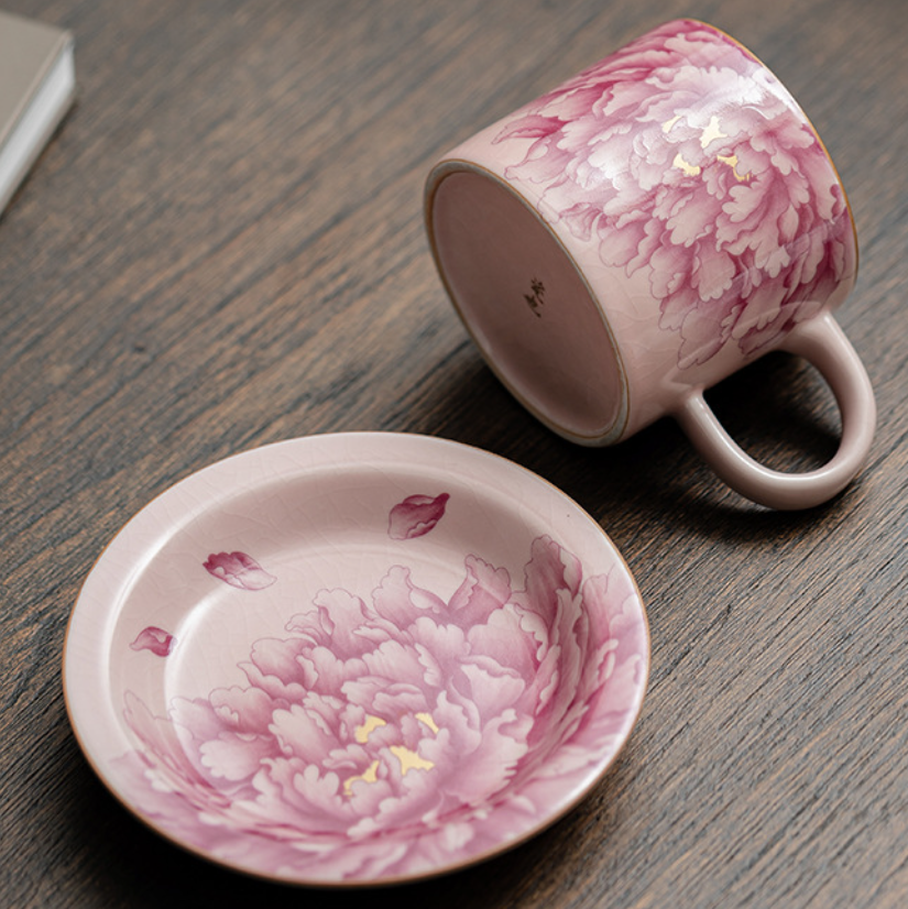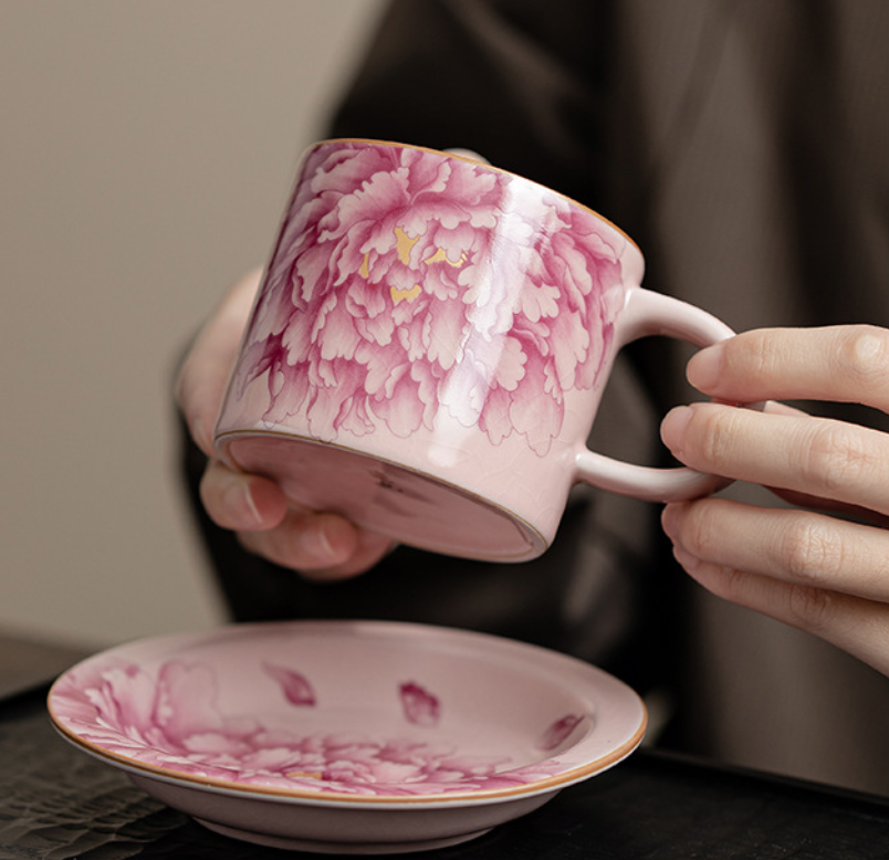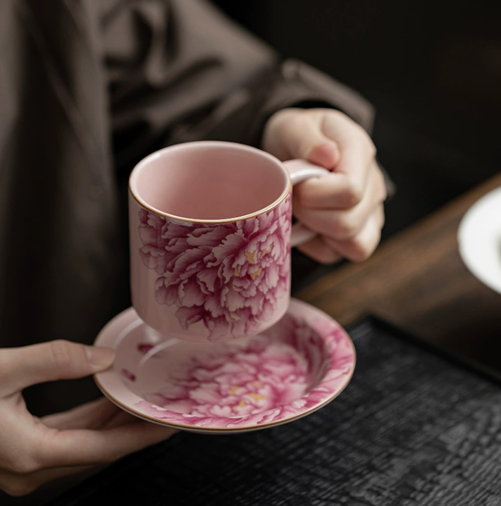 Вишукана керамічна чашка з блюдцем у національному китайському стилі з ніжним квітковим орнаментом півонії — символом краси, гармонії та достатку. Декор виконаний у витонченій техніці з плавними переходами кольору, що створює ефект художнього розпису.