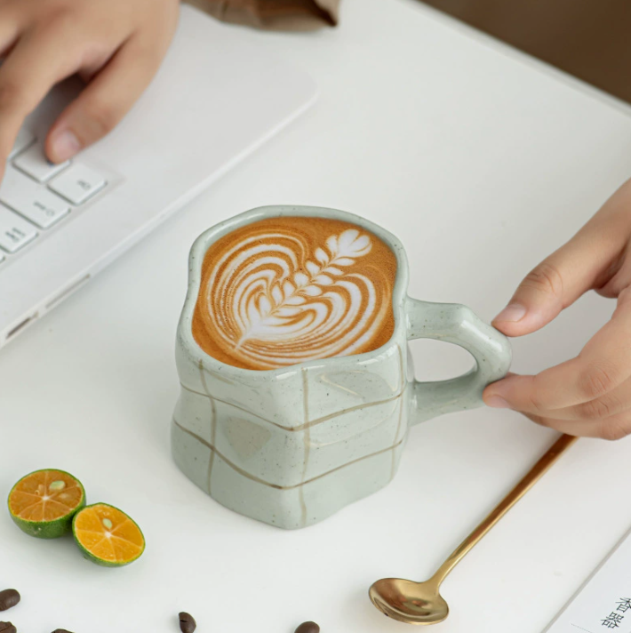 Стильна керамічна кружка ручної роботи, виконана у японському мінімалістичному стилі з елементами ретро. Завдяки оригінальній формі та текстурному дизайну з легким «клітинним» візерунком, вона виглядає естетично та сучасно, ідеально доповнюючи будь-який інтер’єр.