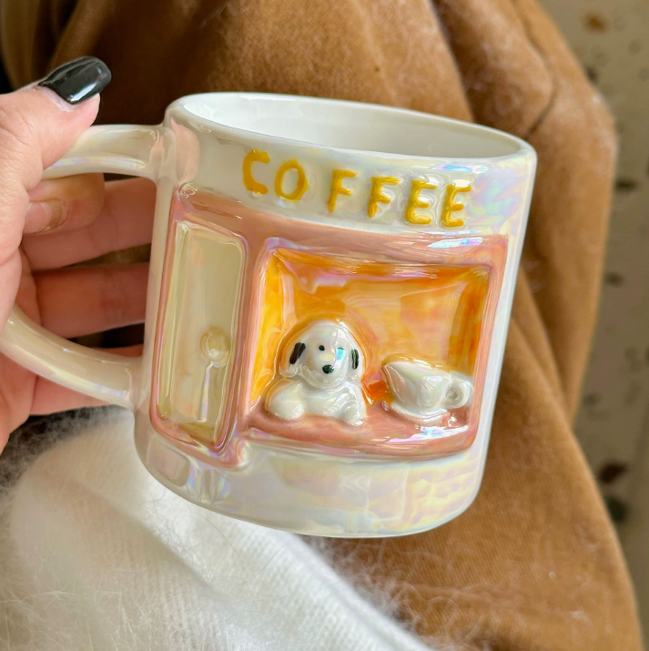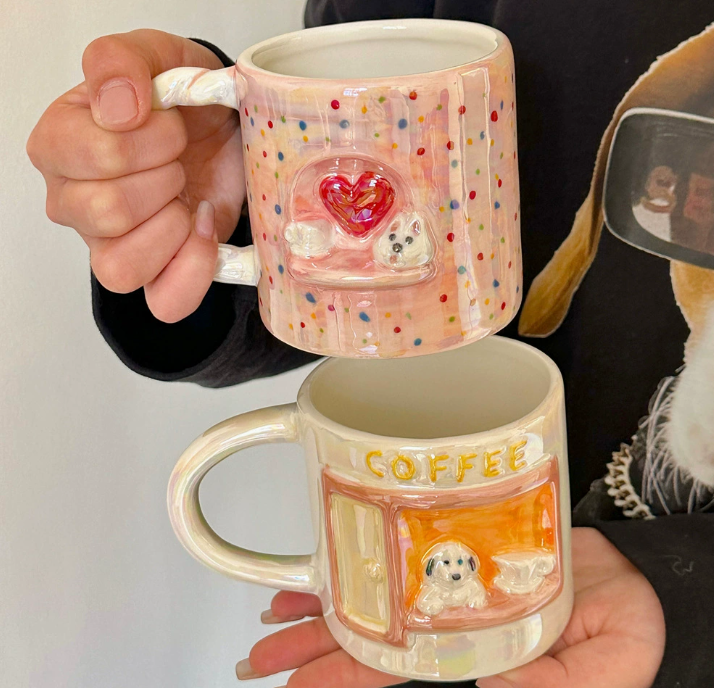 Оригінальна керамічна кружка з рельєфним декором у вигляді милого щеняти та серця — це стильний і теплий аксесуар для щоденного використання. Дизайн виконаний у ніжних перламутрових відтінках із декоративними деталями, що створюють об’ємний ефект і привертають увагу.
