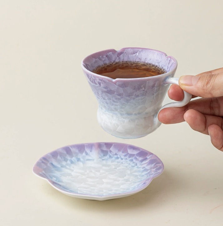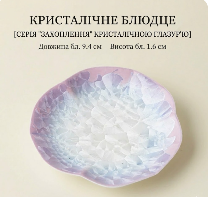 Елегантне блюдце у сучасному мінімалістичному стилі — це поєднання витонченого дизайну та унікальної технології кристалізованої глазурі. Градієнтні відтінки фіолетового створюють ефект природних кристалів, роблячи кожен виріб неповторним.