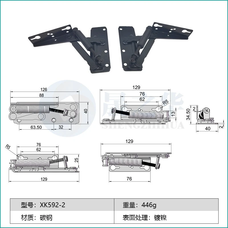 Комплект пружинних підйомних петель XK592 призначений для встановлення на верхні та нижні відкидні дверцята шаф, меблеві фасади та складні конструкції. У комплект входить ліва та права петля, які працюють у парі, забезпечуючи рівномірний розподіл навантаження та стабільну роботу механізму. Пружинна система допомагає плавно відкривати фасад і утримувати його у відкритому положенні під кутом до 80°, зменшуючи навантаження на меблеву конструкцію. Виготовлені з міцної вуглецевої сталі із захисним покриттям для довговічної та надійної експлуатації.