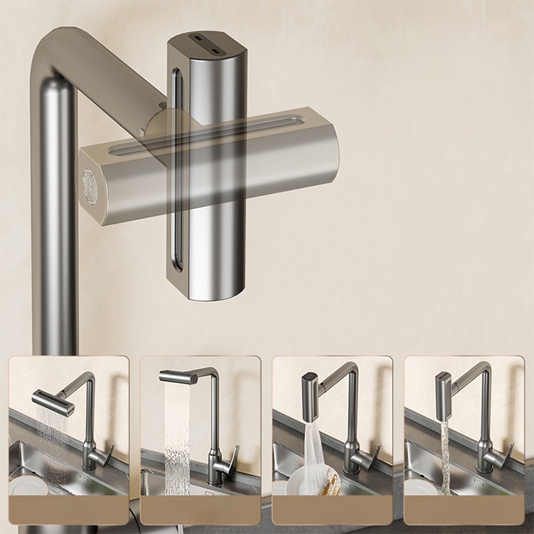 Сучасний кухонний змішувач із поворотним високим виливом та інтелектуальним перемиканням 4 режимів подачі води. Оснащений широким каскадним виливом (ефект «водоспад») та додатковими режимами для миття посуду, овочів і очищення мийки.