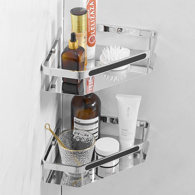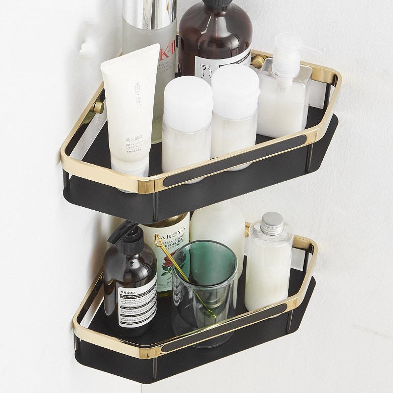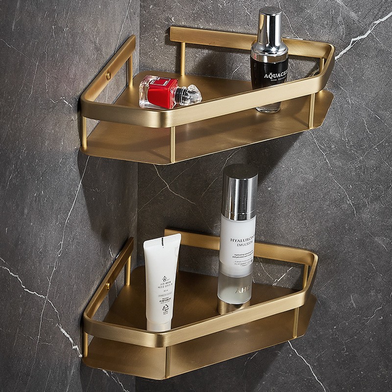 Стильна дворівнева кутова полиця для ванної кімнати поєднує міцність нержавіючої сталі та елегантний латунний декор. Завдяки двом ярусам забезпечує більше місця для зберігання шампунів, гелів, косметики та аксесуарів. Конструкція має бортики для захисту від падіння та вентиляційні отвори для відведення води. Підходить для встановлення у ванній кімнаті або душовій зоні. Стійка до вологи, корозії та утворення іржі.