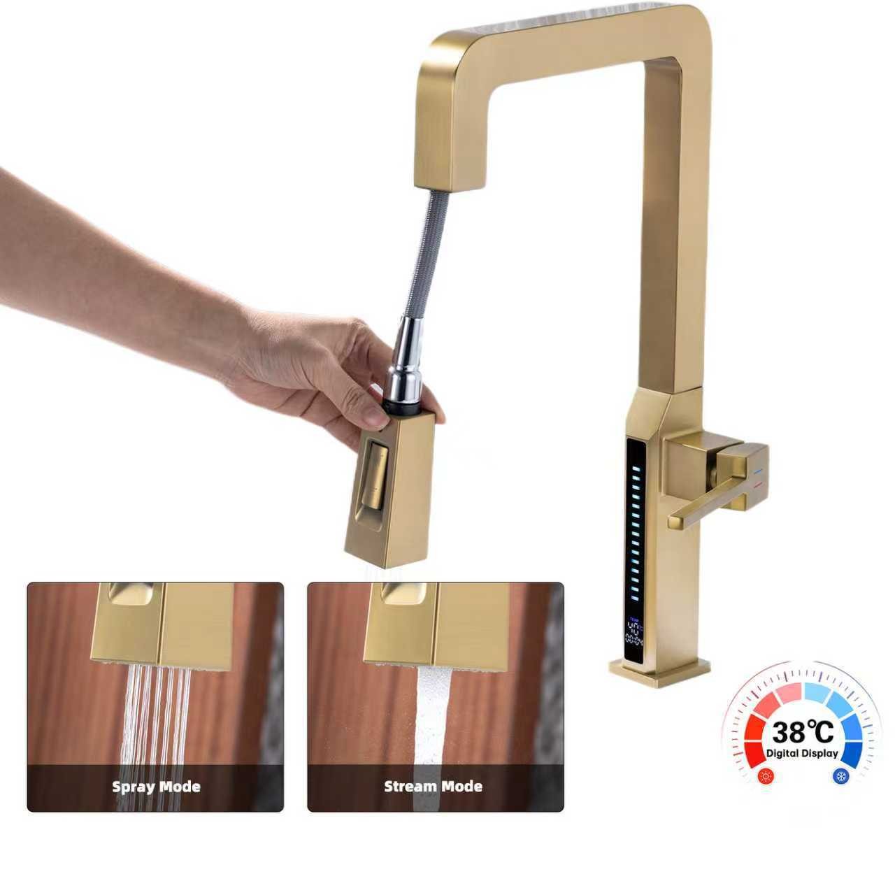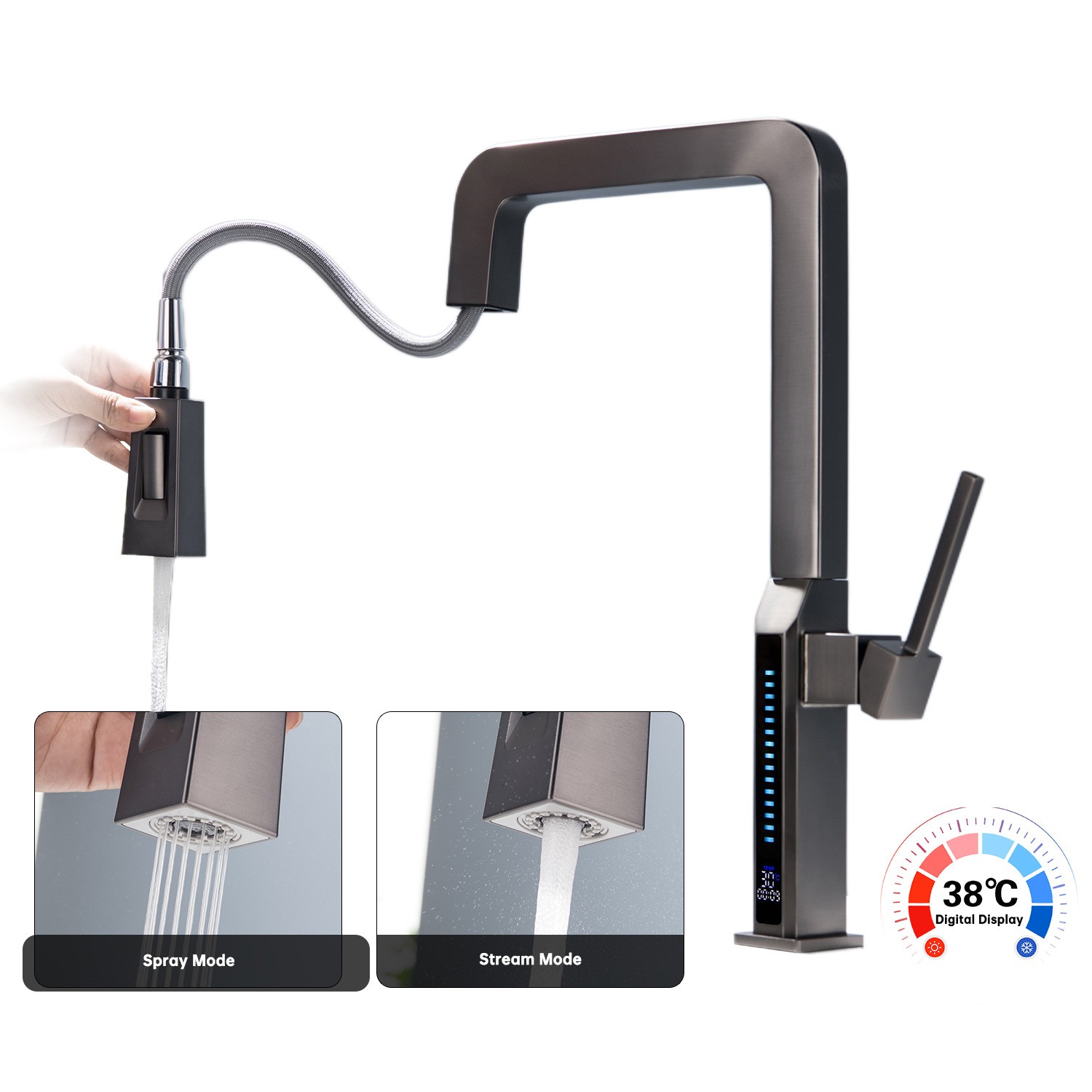 Сучасний квадратний кухонний змішувач із висувною лійкою та цифровим індикатором температури — поєднання технологій та стильного дизайну. Підходить для сучасних кухонь у стилі мінімалізм, loft або hi-tech.