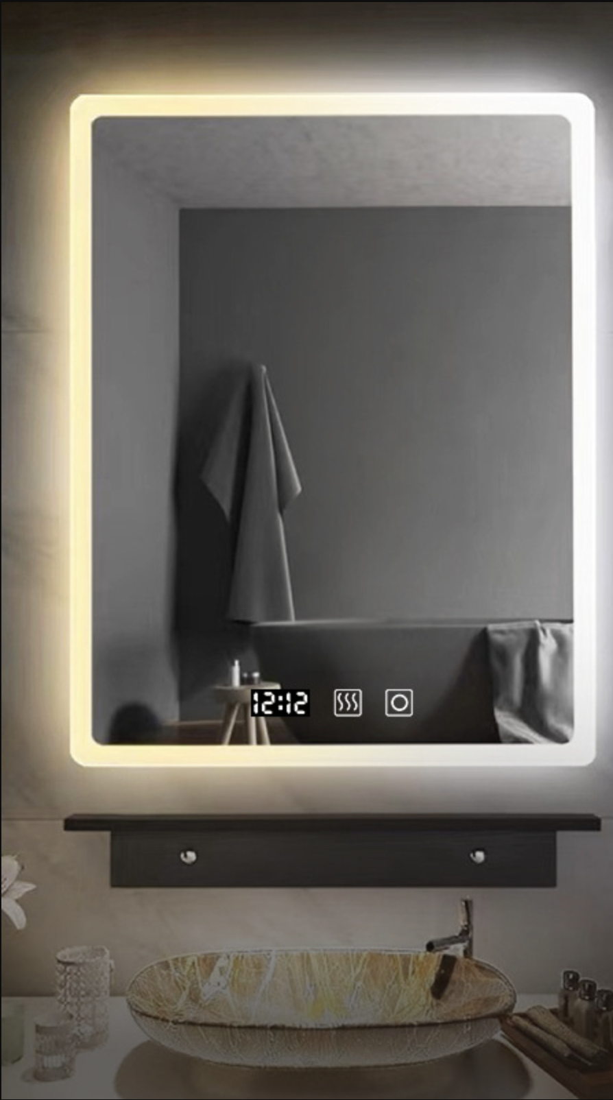 Сучасне прямокутне LED дзеркало без рами, створене для стильних та функціональних ванних кімнат. Дзеркало оснащене підсвіткою з білим світлом, що забезпечує чітке та рівномірне освітлення обличчя без тіней. Воно ідеально підходить для щоденного догляду, макіяжу, гоління та інших процедур.