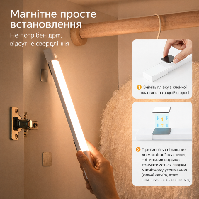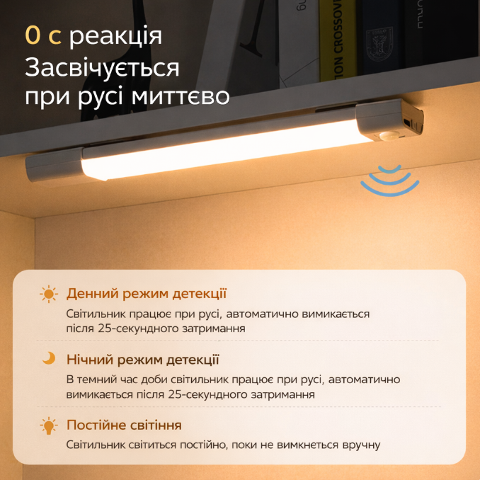 Сучасний бездротовий світильник з індукційним датчиком руху — ідеальне рішення для шафи, кухні, коридору, сходів або спальні. Лампа автоматично вмикається при русі та вимикається через 25 секунд після його відсутності.