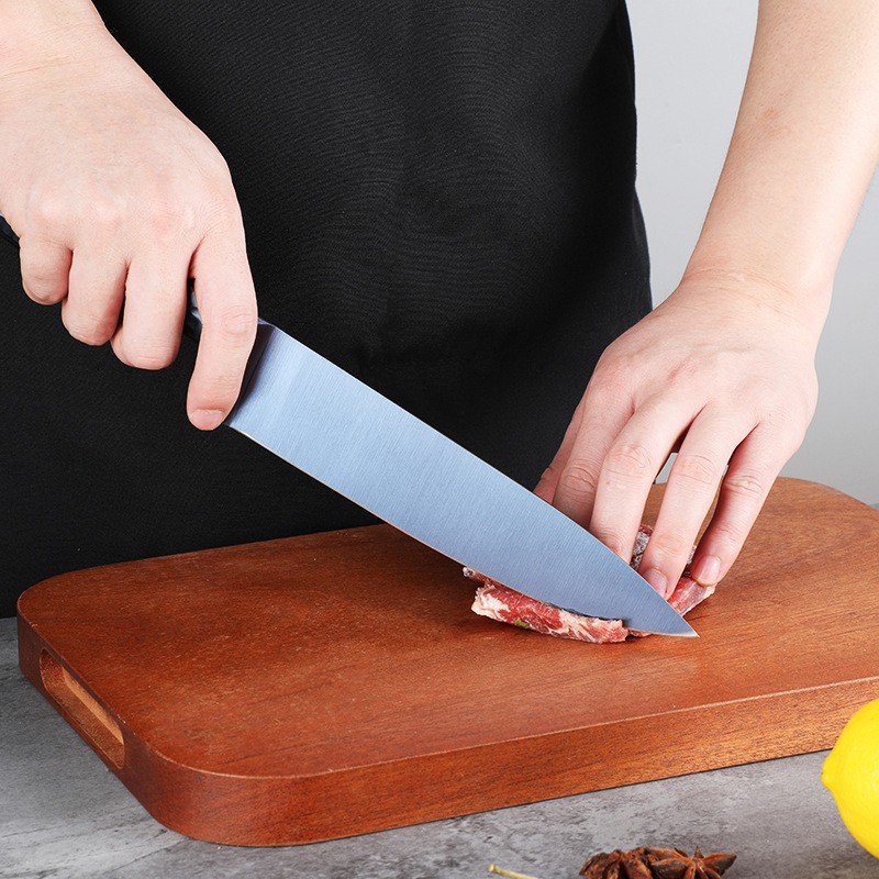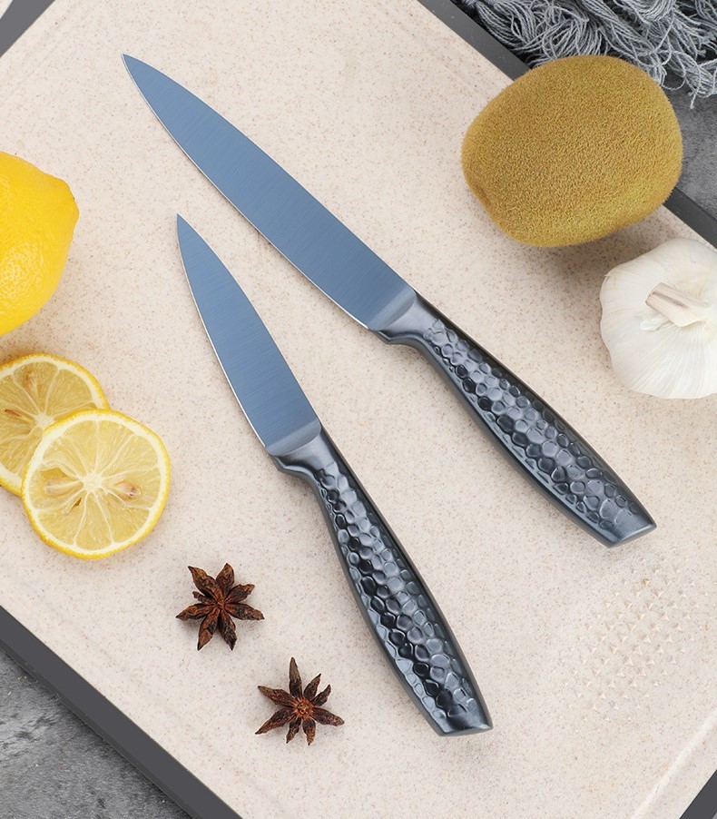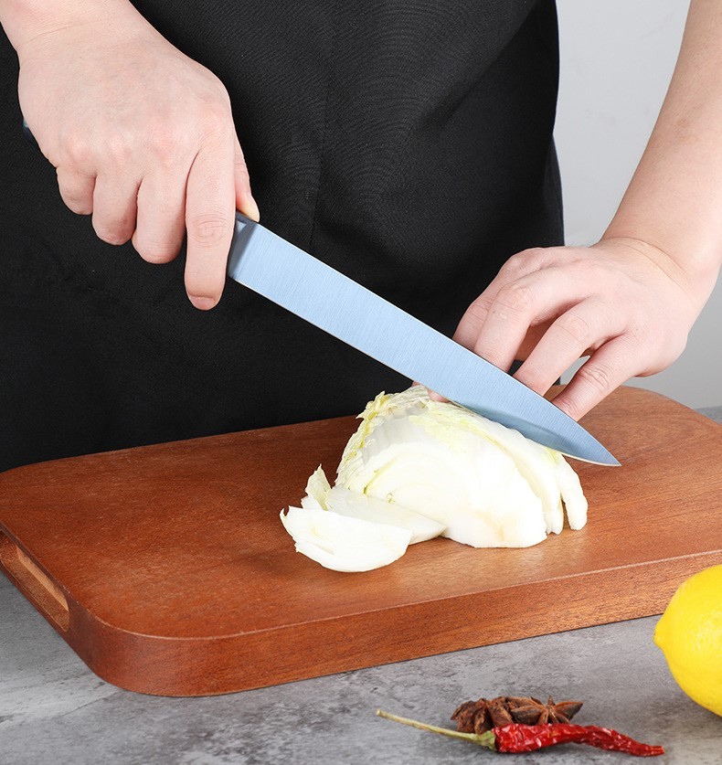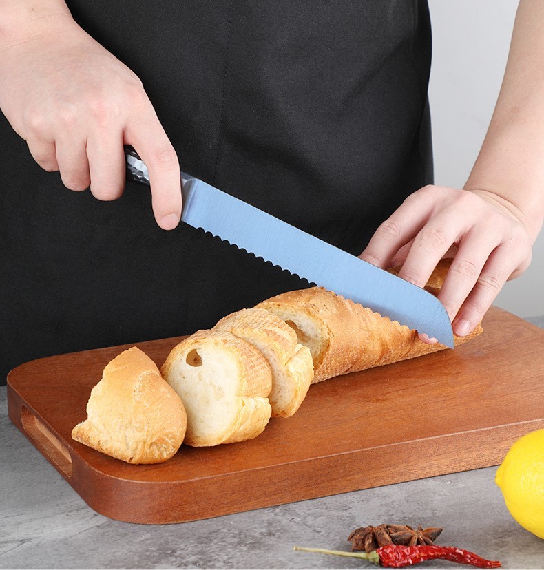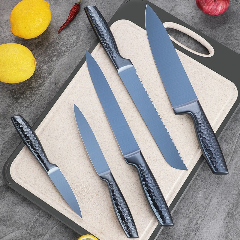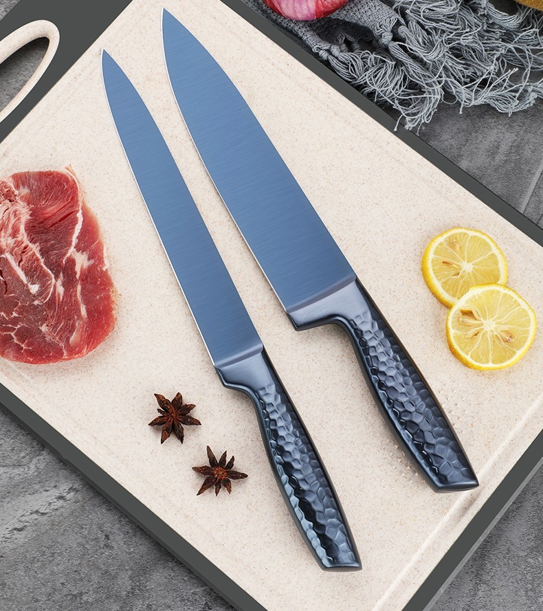Набір кухонних ножів із синім титановим покриттям, виготовлений з високоякісної нержавіючої сталі.