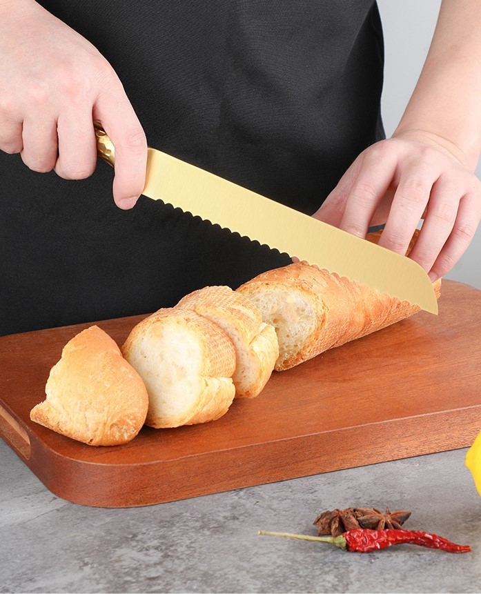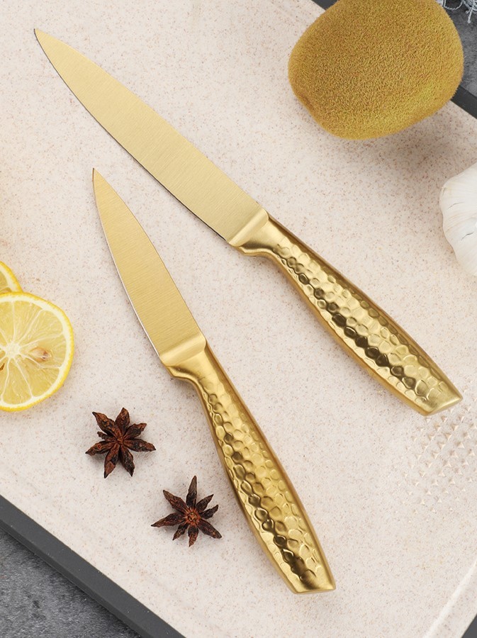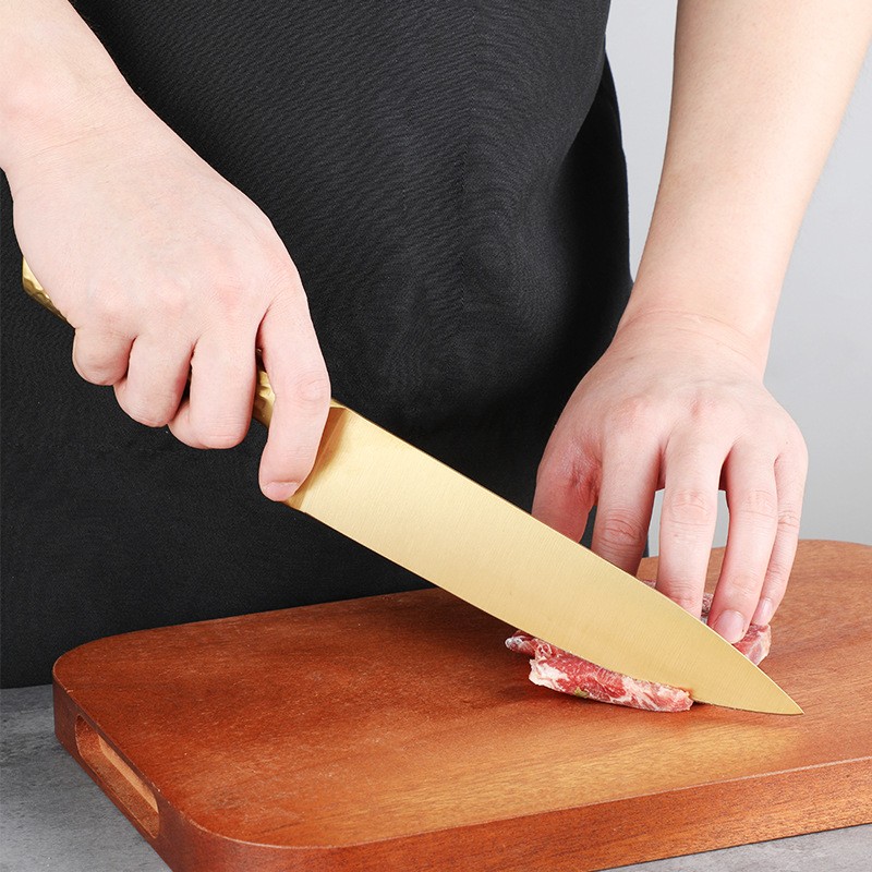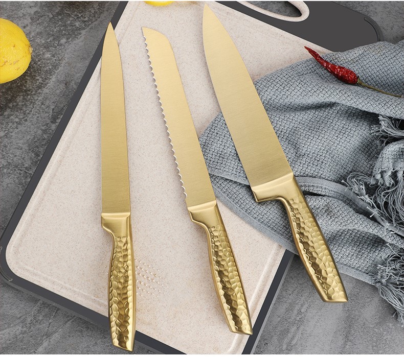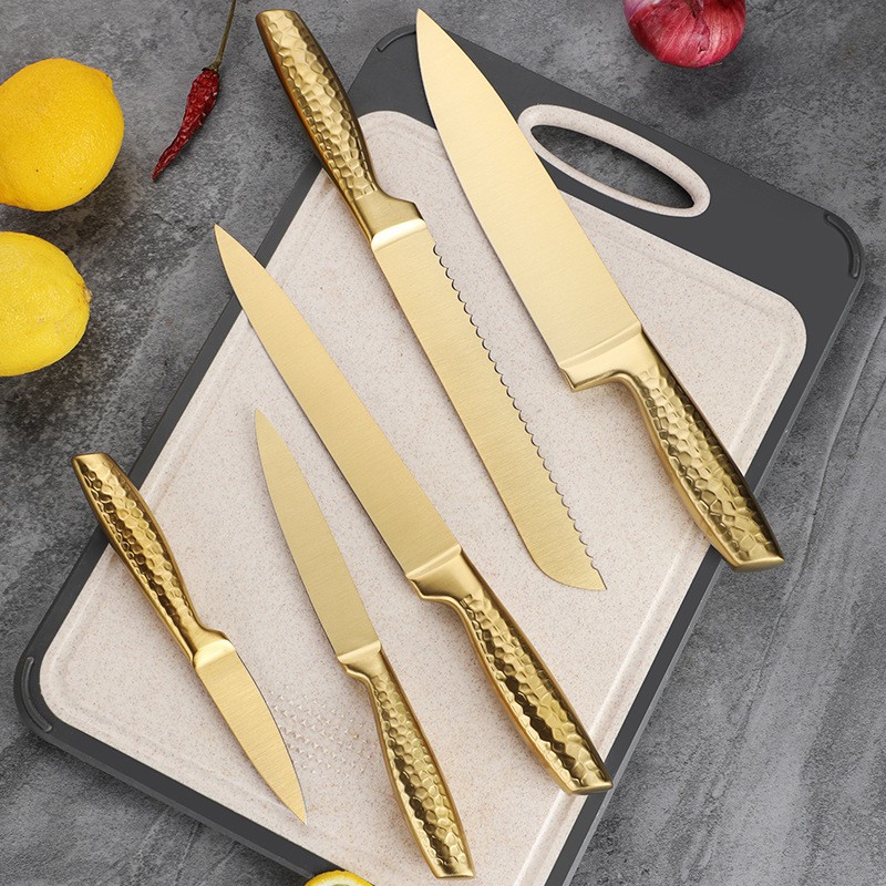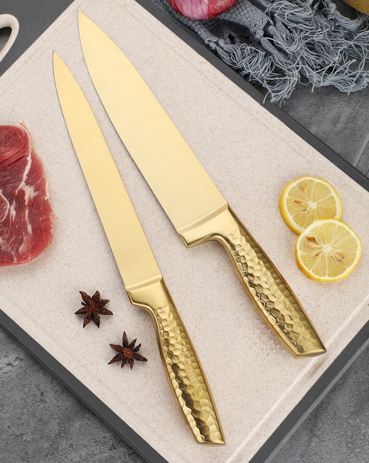 Набір кухонних ножів із золотистим титановим покриттям, виготовлений з високоякісної нержавіючої сталі.
