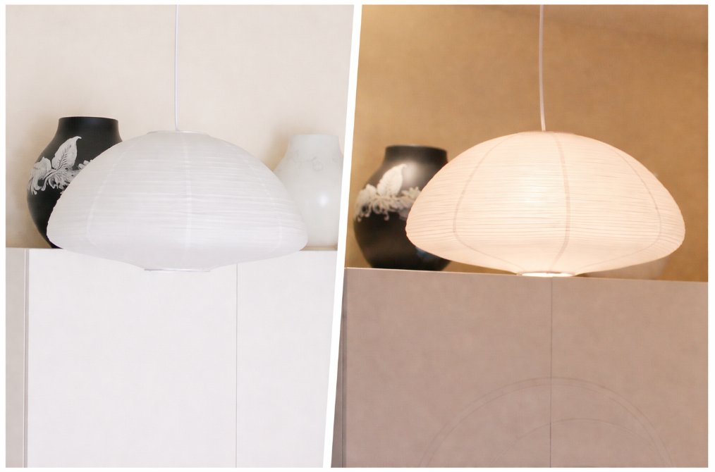 Абажур виконаний у вигляді круглого паперового ліхтаря, що забезпечує рівномірне та комфортне освітлення без різкого блиску для очей. Завдяки регульованій висоті підвісу (до 1 метра) світильник легко адаптується до різної висоти стелі та особливостей інтер’єру.
