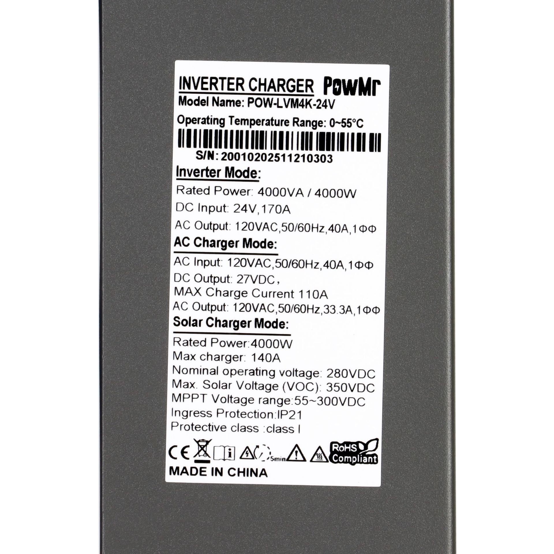 Powmr 4000W — це компактний автономний сонячний інвертор формату All-in-One, призначений для невеликих домашніх систем зберігання енергії та локальних off-grid рішень. Модель працює з вихідною напругою 110 В за американським стандартом і підходить для живлення побутових приладів, освітлення, електроніки та базових енергоємних споживачів.