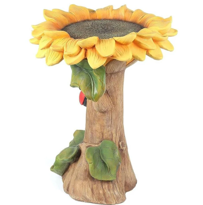 Поїлка створена так, щоб птахам було зручно пити воду або купатися. Широка чаша у формі квітки дозволяє зручно розміщуватися маленьким садовим птахам. Основа виконана у вигляді декоративного деревця з листям та милим сонечком, що надає виробу особливого шарму.