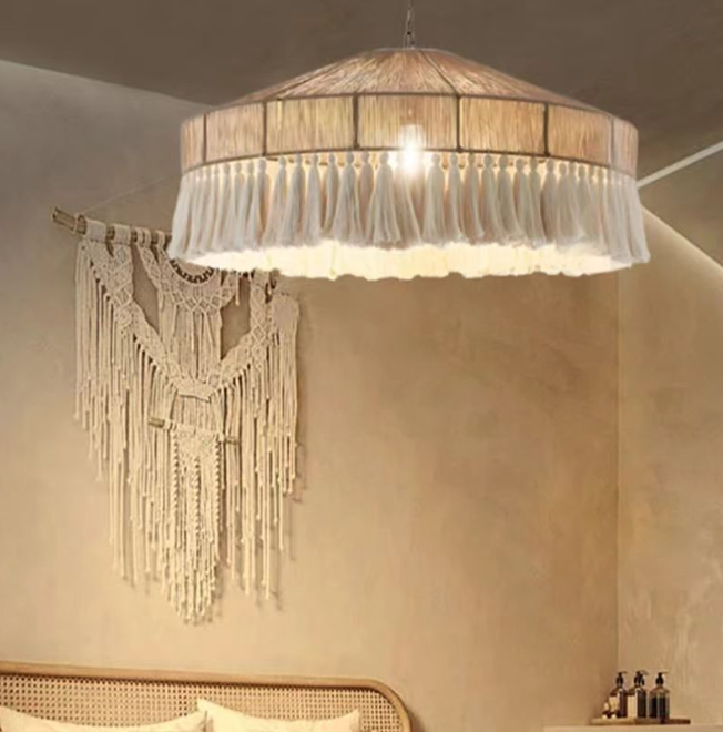 Стильна ретро люстра з металевим корпусом та абажуром із конопляної мотузки стане яскравим акцентом у сучасному або лофт-інтер’єрі. Поєднання металу та натуральної текстури мотузки створює атмосферу затишку та оригінальності, що ідеально підходить для дому, ресторану чи кафе.