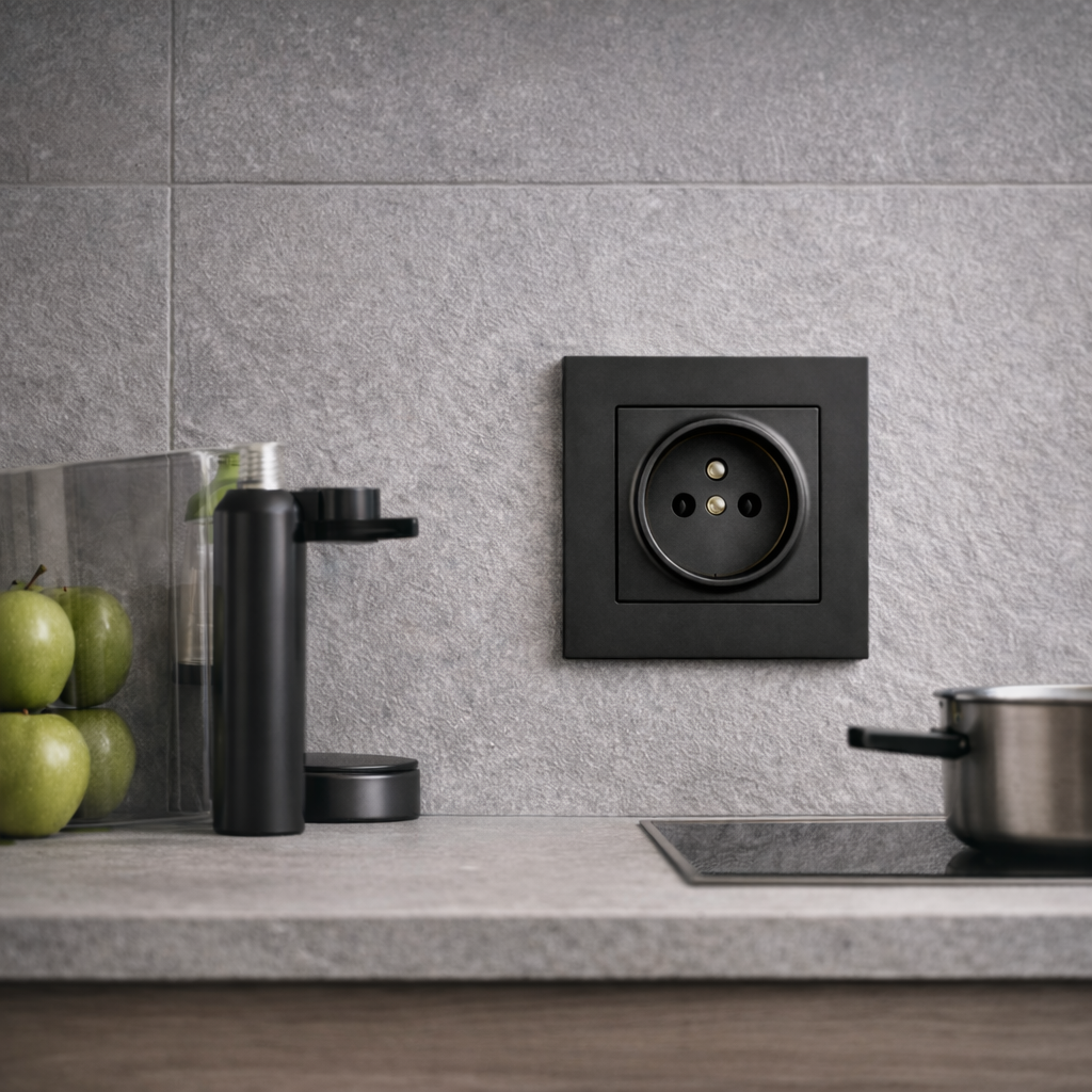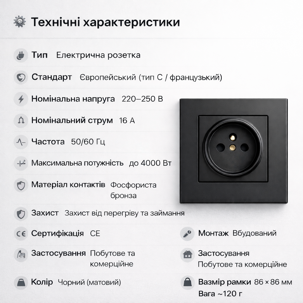 Стильна та функціональна електрична розетка – сучасне рішення для дому, квартири або офісу. Мінімалістичний дизайн у чорному матовому кольорі виглядає дорого та гармонійно вписується в сучасні інтер’єри: кухню, спальню, ванну кімнату, вітальню, передпокій або робочу зону.