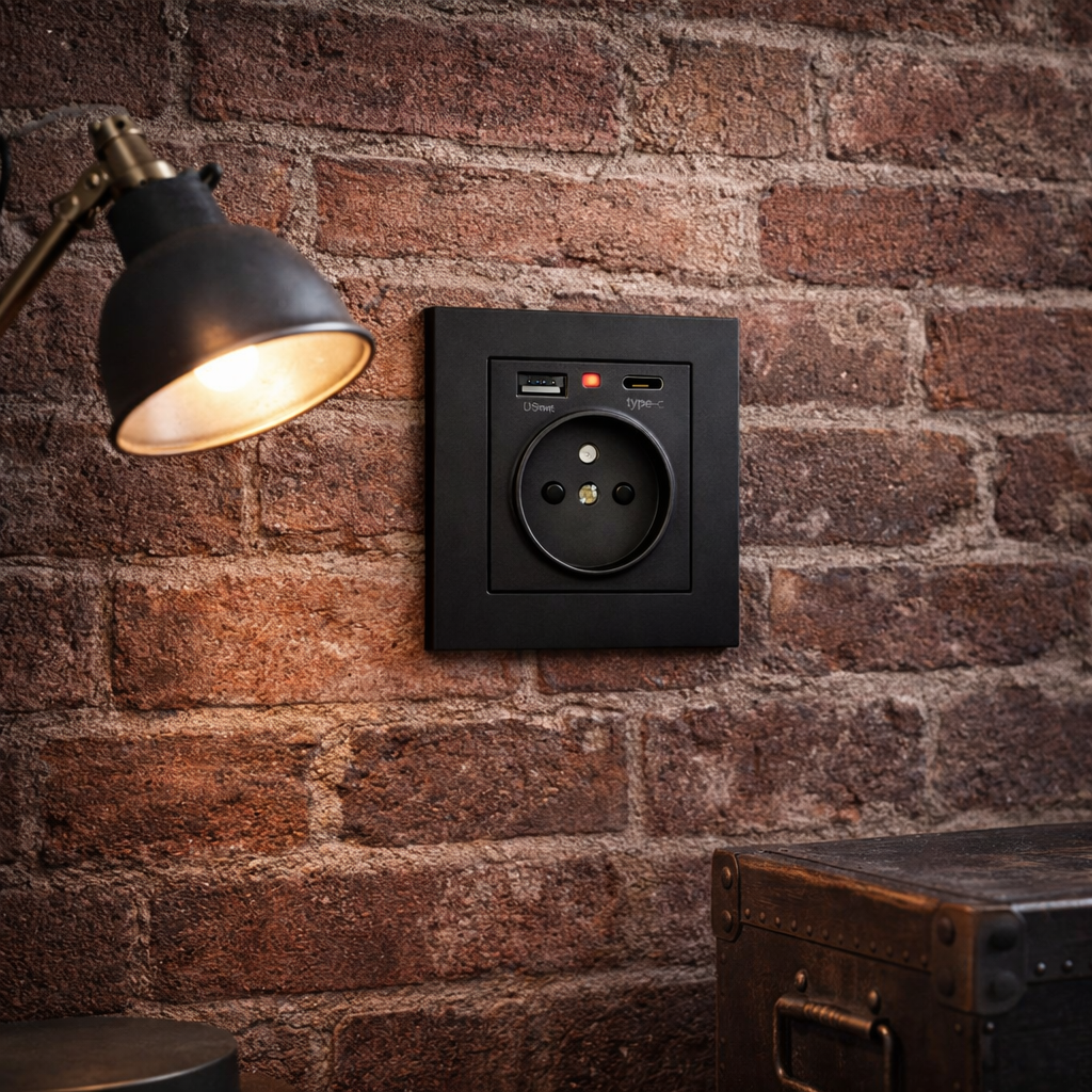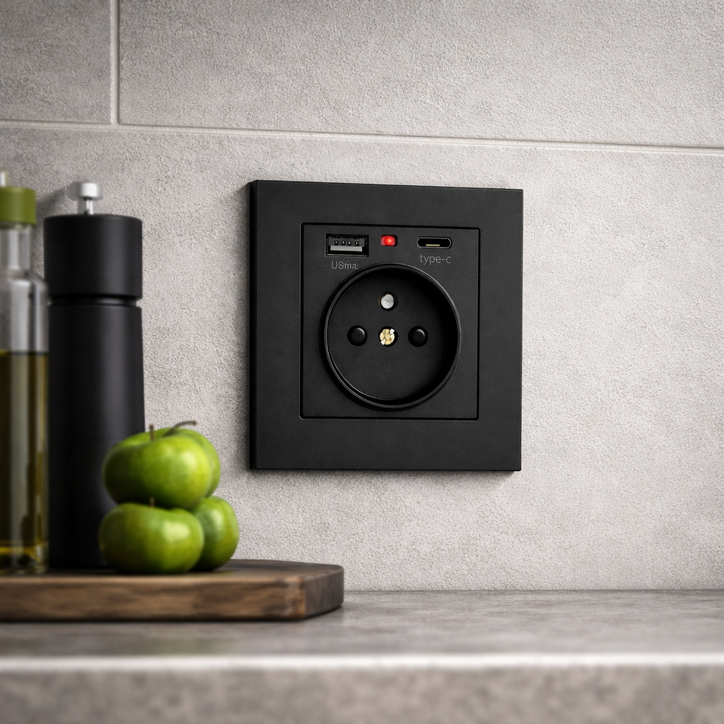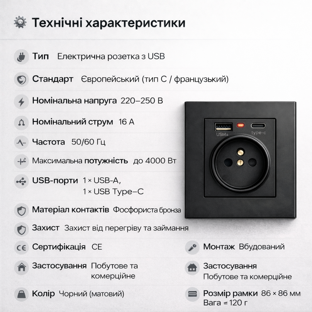 Стильна та функціональна електрична розетка з USB-портами — сучасне рішення для дому, квартири або офісу. Мінімалістичний дизайн у чорному матовому кольорі виглядає дорого та гармонійно вписується в сучасні інтер’єри: кухню, спальню, ванну кімнату, вітальню, передпокій або робочу зону.