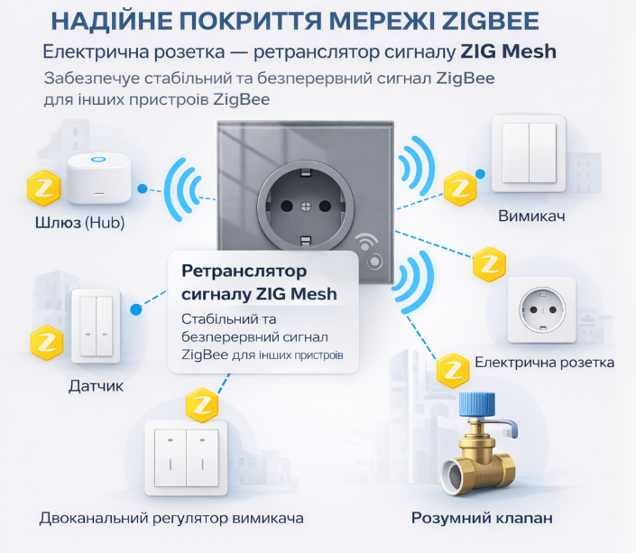 ✔ Підключення через ZigBee 3.0 (Mesh мережа) — стабільний сигнал і розширене покриття