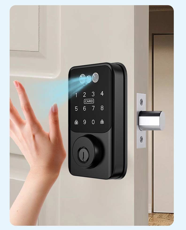 Максимальна версія смарт-замка D002 із розширеним біометричним доступом: розпізнавання обличчя, долоні (venous scan), відбитка пальця, а також відкриття через пароль, картку, ключ або додаток.