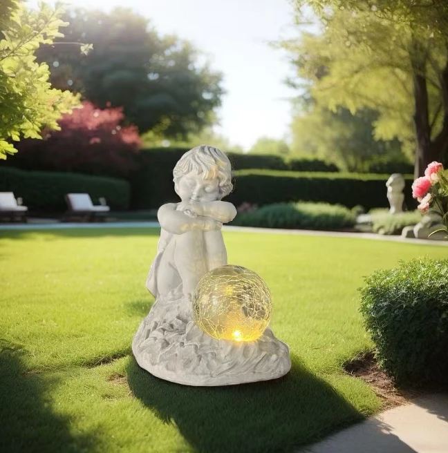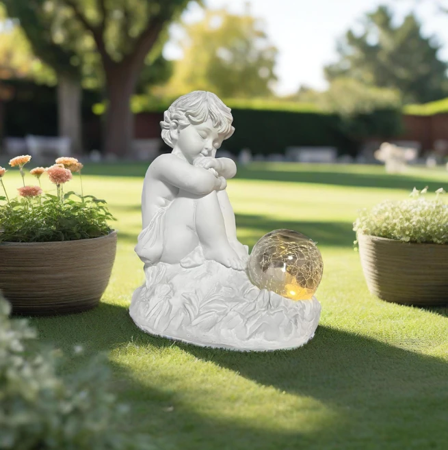 Декоративна садова фігурка «Ангел із світловою кулею» — це витончений елемент ландшафтного декору, який додає саду атмосферу спокою, гармонії та романтики. Скульптура зображує ангела, що ніжно тримає світлову кулю, яка створює м’яке тепле підсвічування у вечірній час.