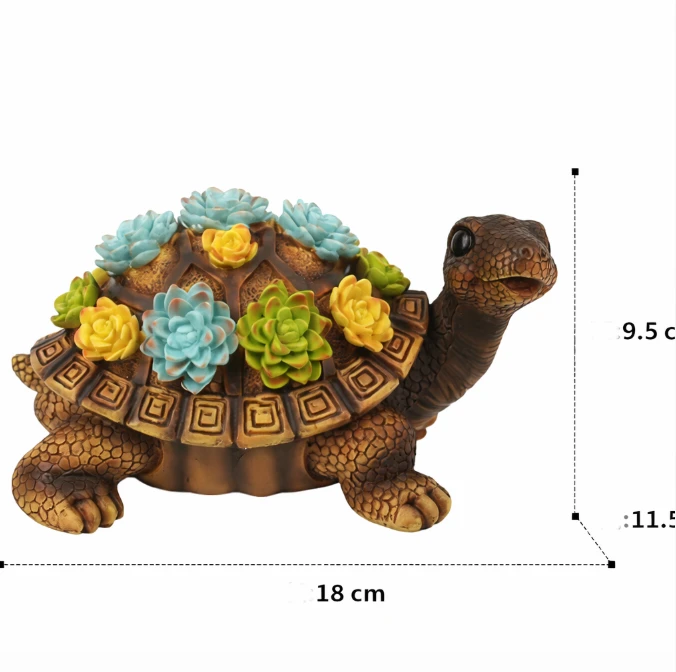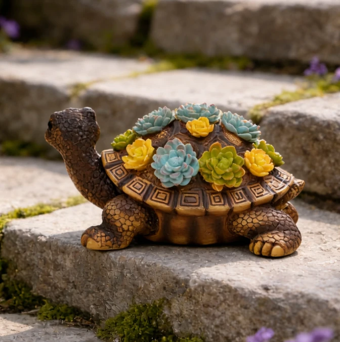 Панцир черепахи прикрашений декоративними сукулентами різних кольорів — зелених, блакитних та жовтих відтінків. Завдяки цьому фігурка виглядає яскраво та гармонійно поєднується з квітами, рослинами та кам’яними доріжками у саду.