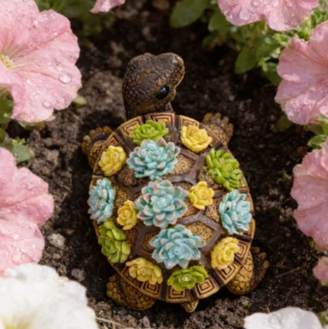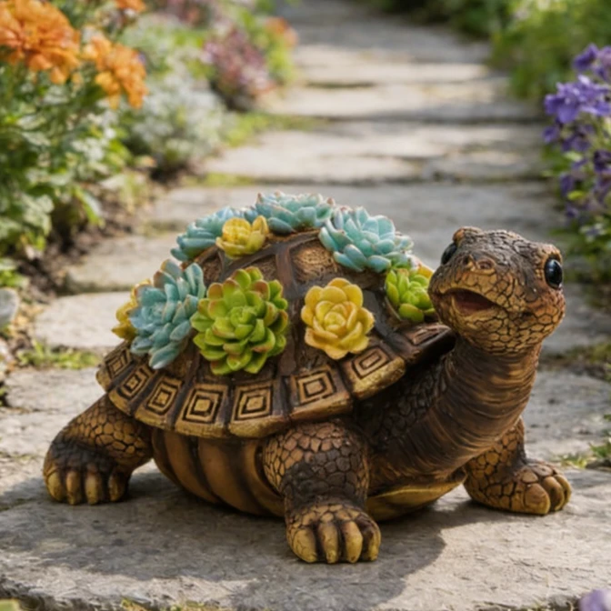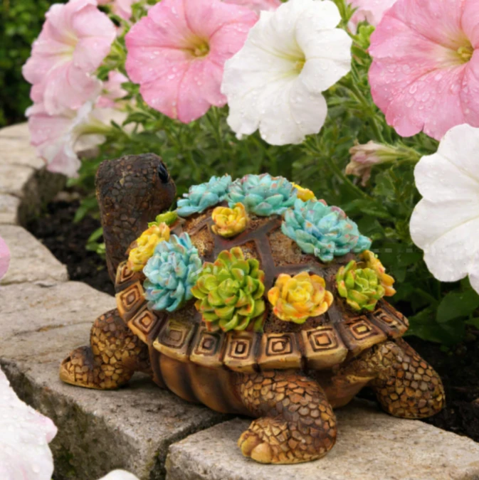 Декоративна садова фігурка у вигляді черепахи з яскравими сукулентами на панцирі — це стильний та оригінальний елемент декору для саду, клумби або подвір’я. Фігурка виглядає дуже реалістично та створює атмосферу затишку в будь-якому зеленому куточку.