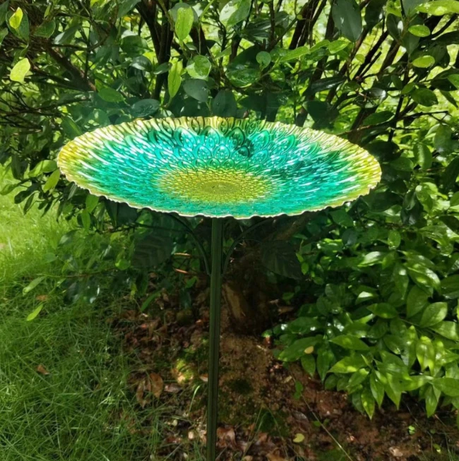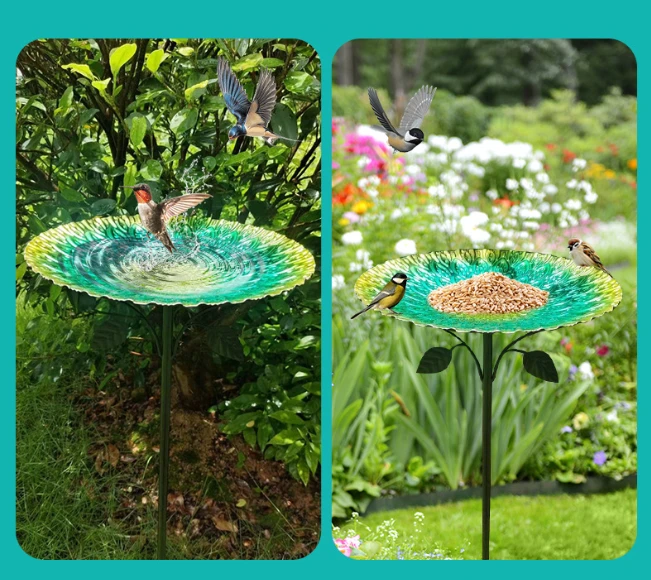 Чаша поїлки виконана у яскравому малахітово-зеленому кольорі з декоративним візерунком, який красиво переливається на сонці. Такий дизайн гармонійно вписується в садовий ландшафт і стає ефектною прикрасою клумб, газонів або садових доріжок.