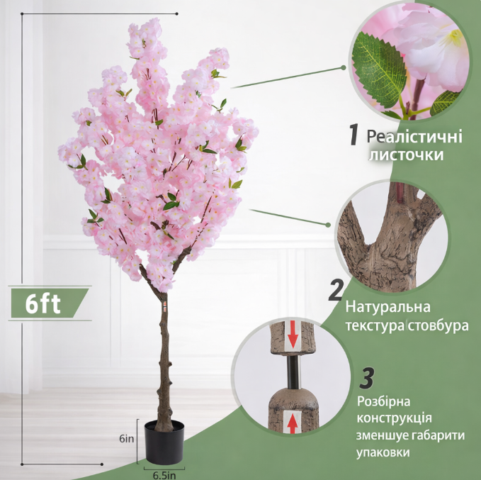Елегантне штучне дерево сакури — це стильний декоративний елемент, який додасть інтер’єру ніжності та витонченості. Реалістичні рожеві квіти створюють атмосферу весни та гармонії, а натуральна текстура стовбура робить дерево максимально схожим на справжню рослину.