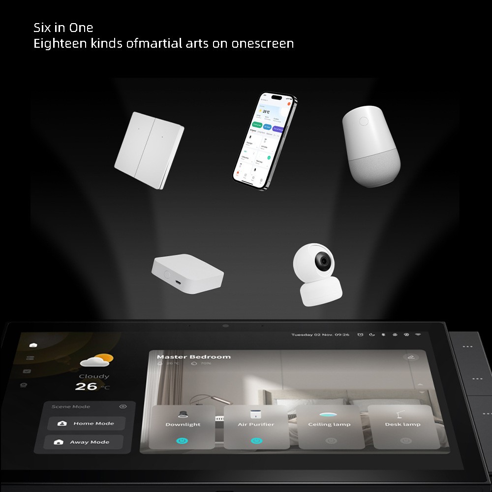 Панель працює в екосистемі Tuya Smart і дозволяє централізовано керувати освітленням, кліматом, розетками, шторами, датчиками та іншими пристроями через єдиний інтерфейс. Камера може використовуватись для відеодзвінків або домофонних сценаріїв (залежно від ПЗ).