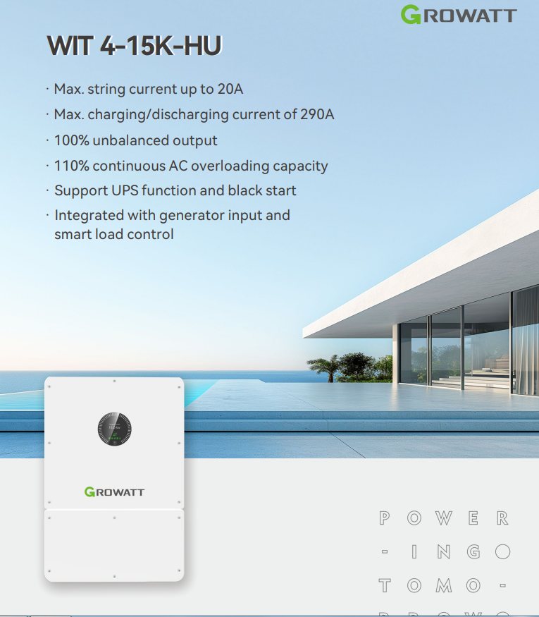 Growatt WIT25K-HU — це високопродуктивний трифазний гібридний сонячний інвертор потужністю 25 кВт для комерційних та приватних СЕС. Пристрій підтримує роботу з мережею, генератором та акумуляторними батареями, забезпечуючи стабільне електроживлення навіть під час відключень.
