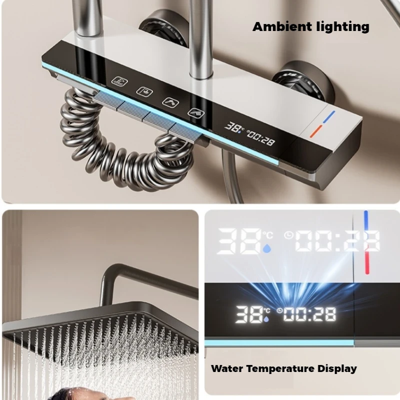 Digital Display Temperature-Controlled Shower Set — це сучасна вбудована душова система з цифровим дисплеєм температури та LED підсвіткою, виконана у стилі Modern Simplicity.