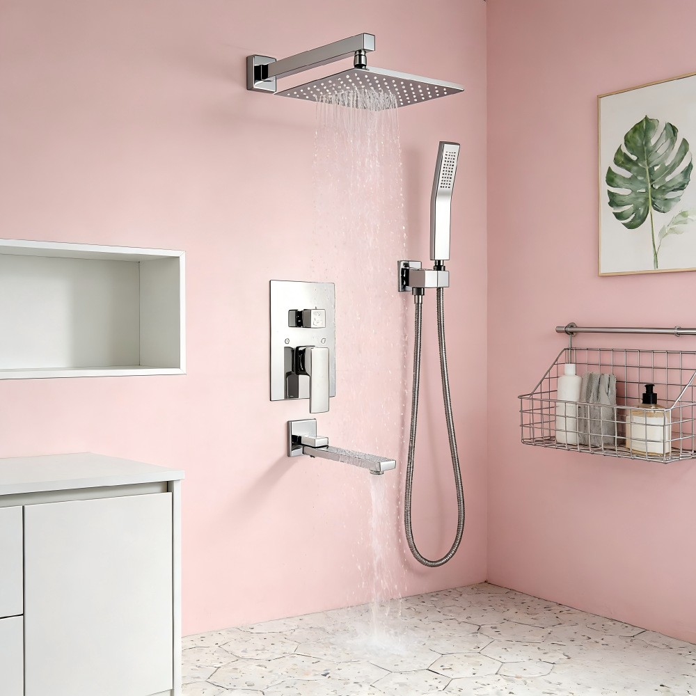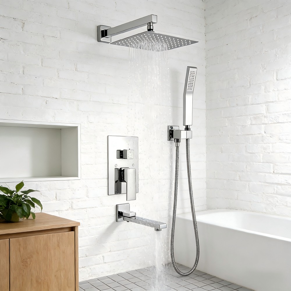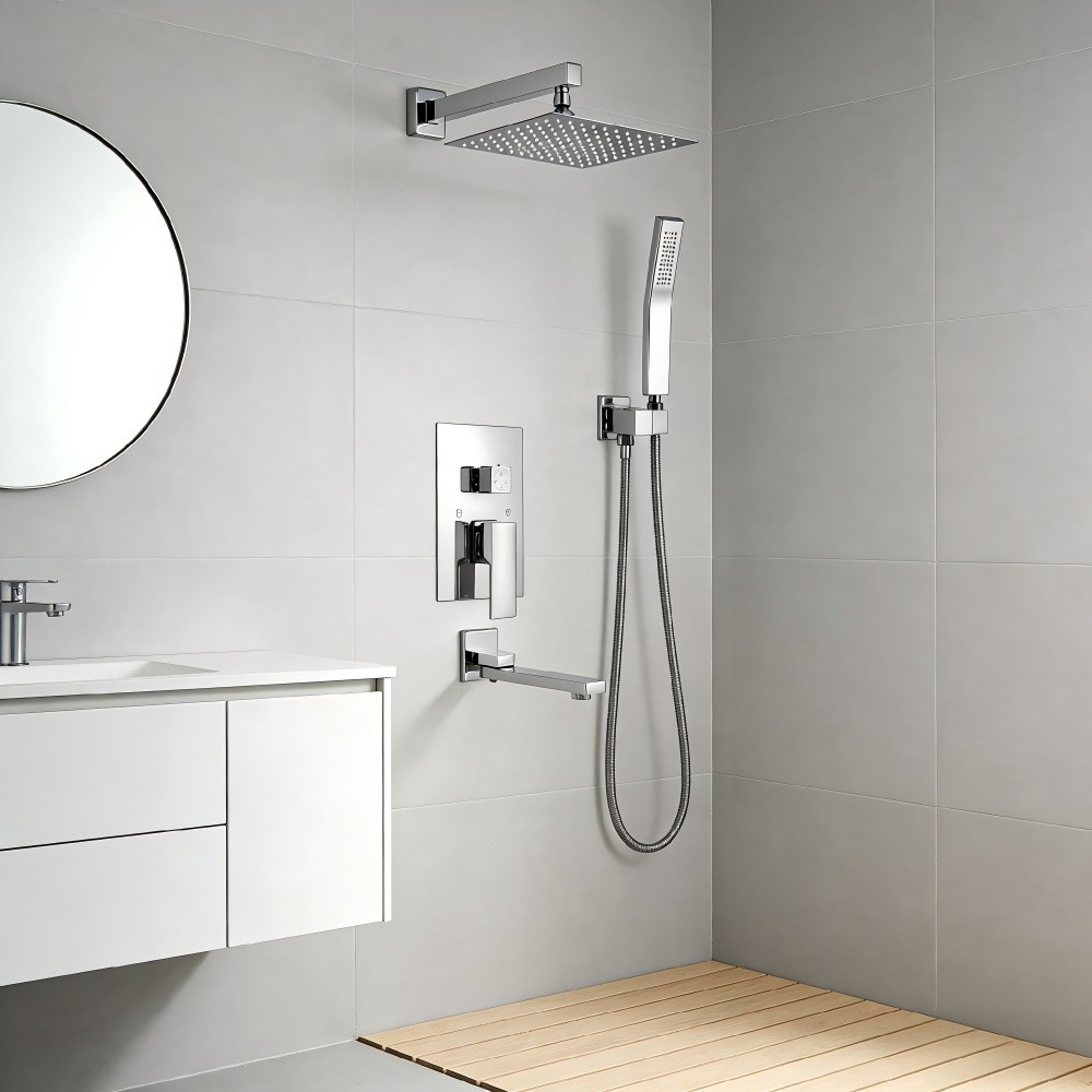 Jamil 8005A — це сучасна вбудована душова система у хромованому виконанні з квадратним верхнім душем, ручною лійкою та поворотним виливом для ванни. Комплект призначений для прихованого монтажу та забезпечує мінімалістичний сучасний вигляд ванної кімнати.
