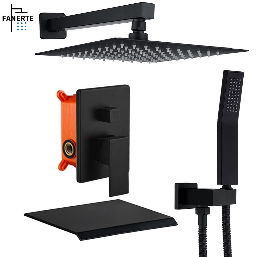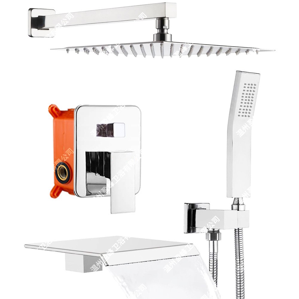 Panel F-Y092-260 — це сучасна вбудована душова система з функцією водоспаду для наповнення ванни та квадратним верхнім душем 8 дюймів. Комплект виконаний із латуні з хромованим або чорним покриттям та призначений для прихованого монтажу в стіну.