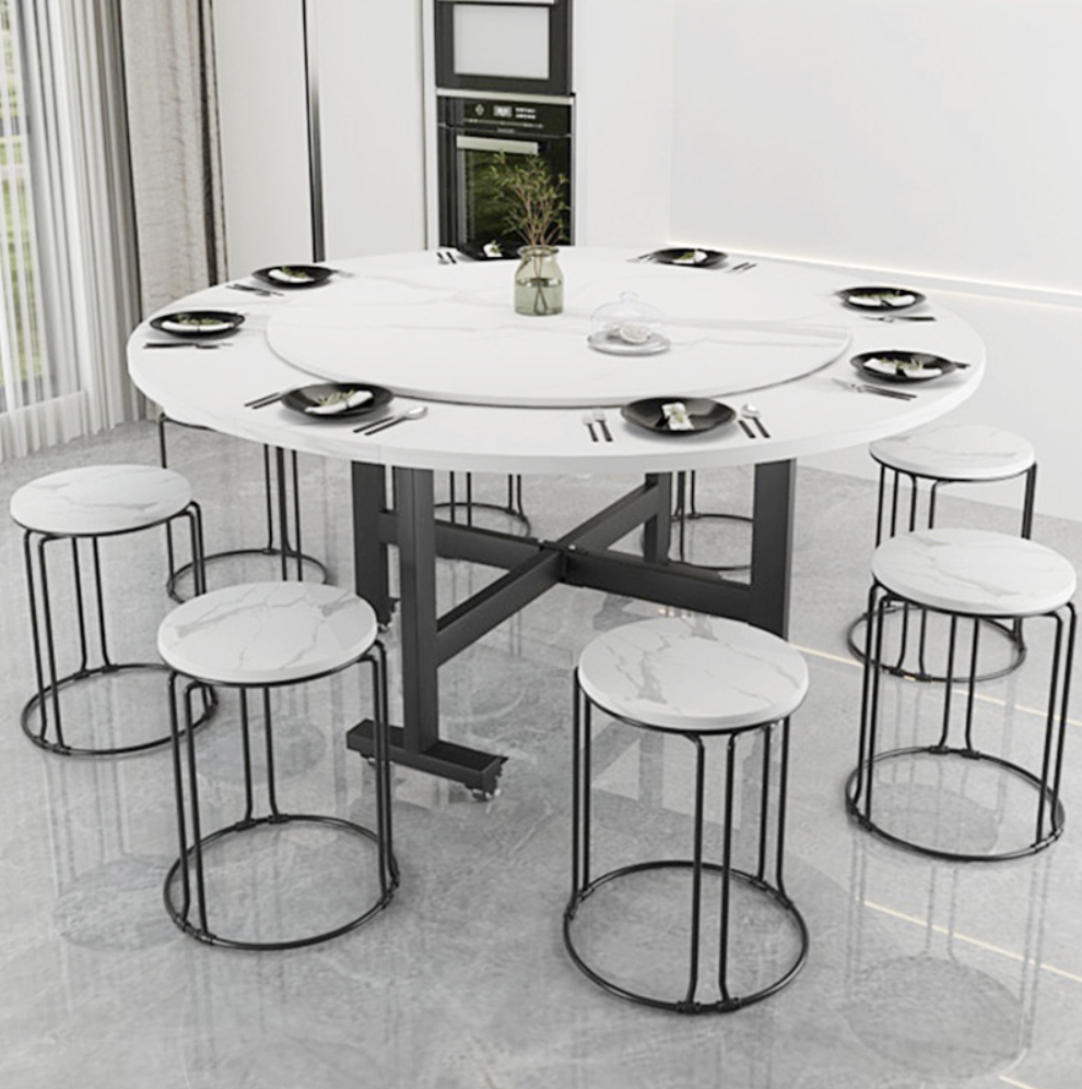 Сучасний круглий розкладний обідній стіл у мінімалістичному стилі — практичне рішення для квартири, будинку або невеликого ресторану. Завдяки продуманій конструкції стіл легко трансформується та дозволяє комфортно розмістити від 4 до 16 осіб залежно від обраного діаметра.