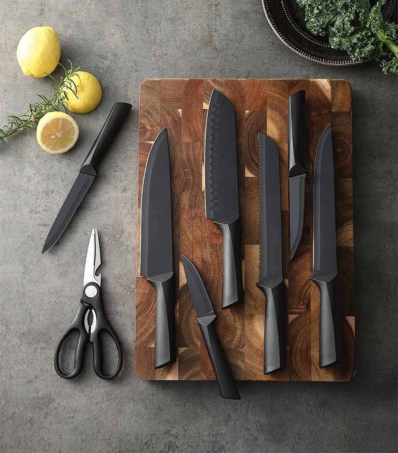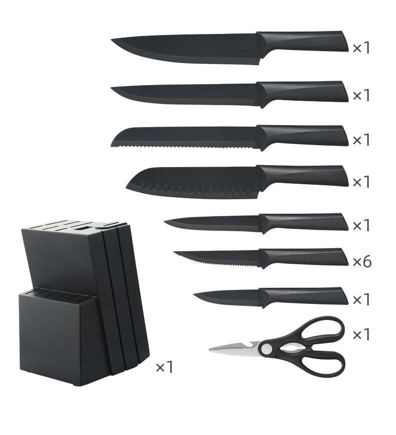 Набір кухонних ножів із 14 предметів, включаючи підставку для ножів.
